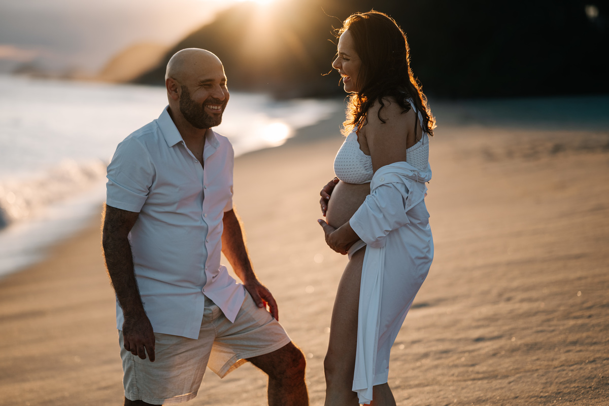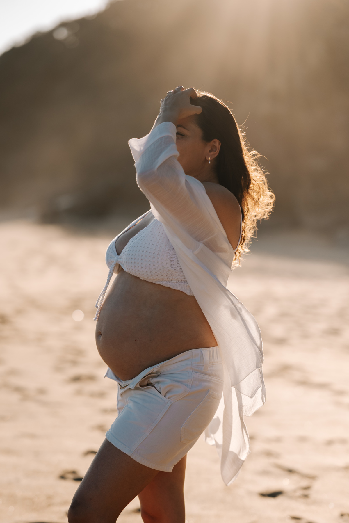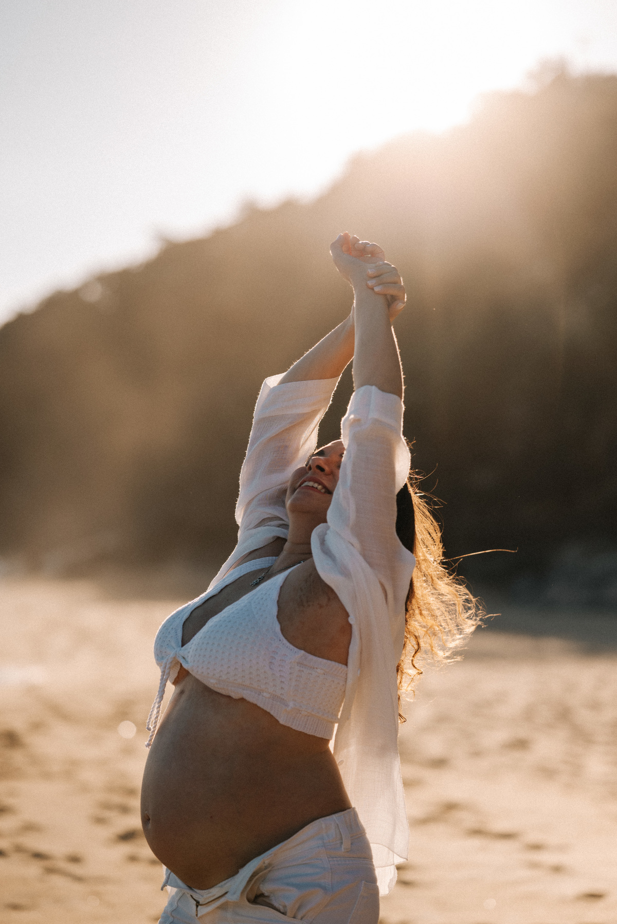 Esse ensaio gestante na praia em Boiçucanga foi realizado no final da tarde, aproveitando a luz do pôr do sol — mais suave, quente e ideal para fotos ao ar livre.