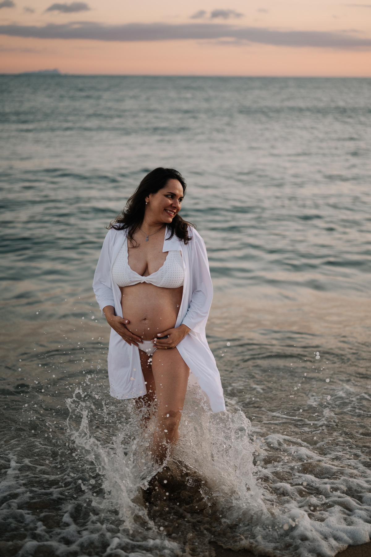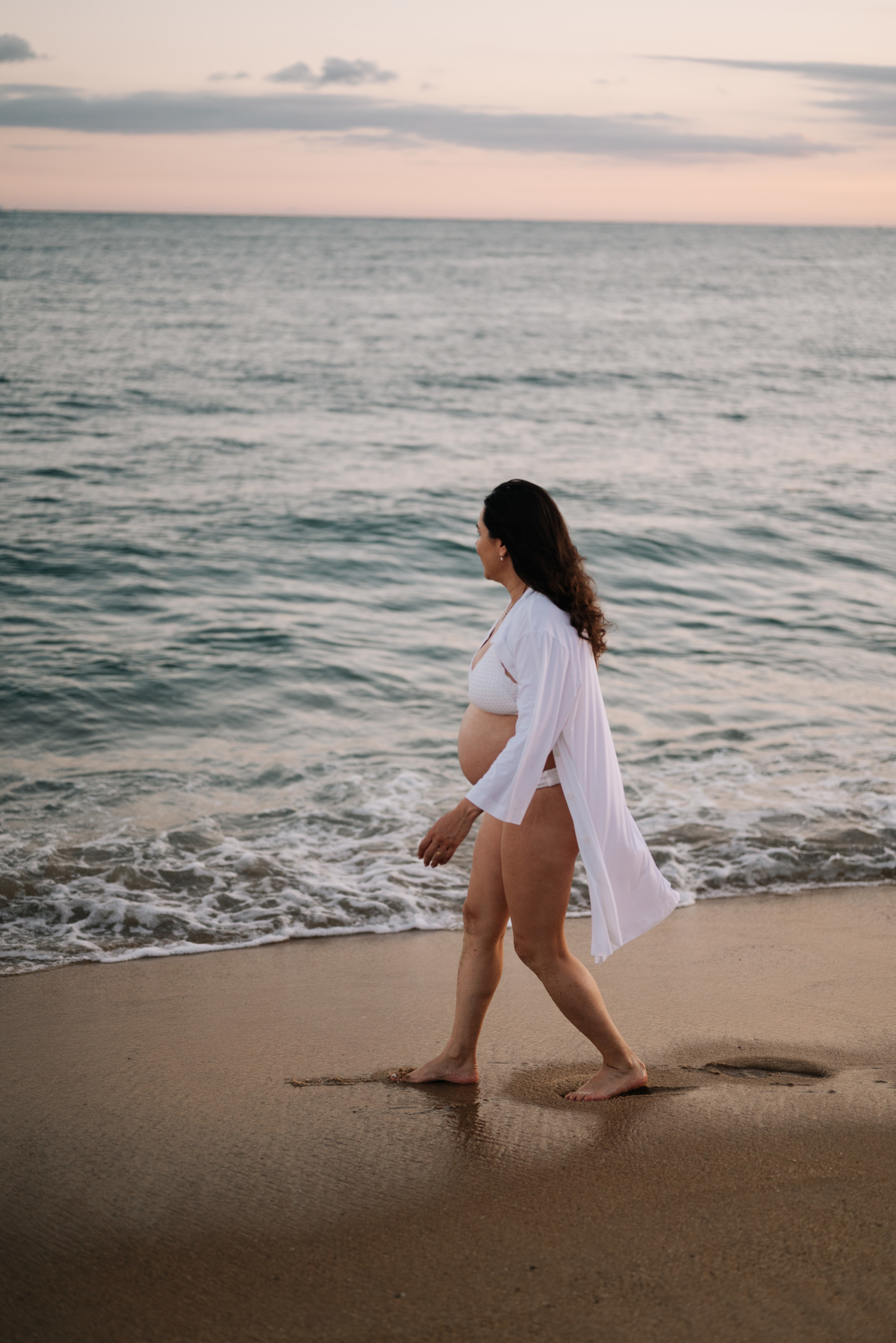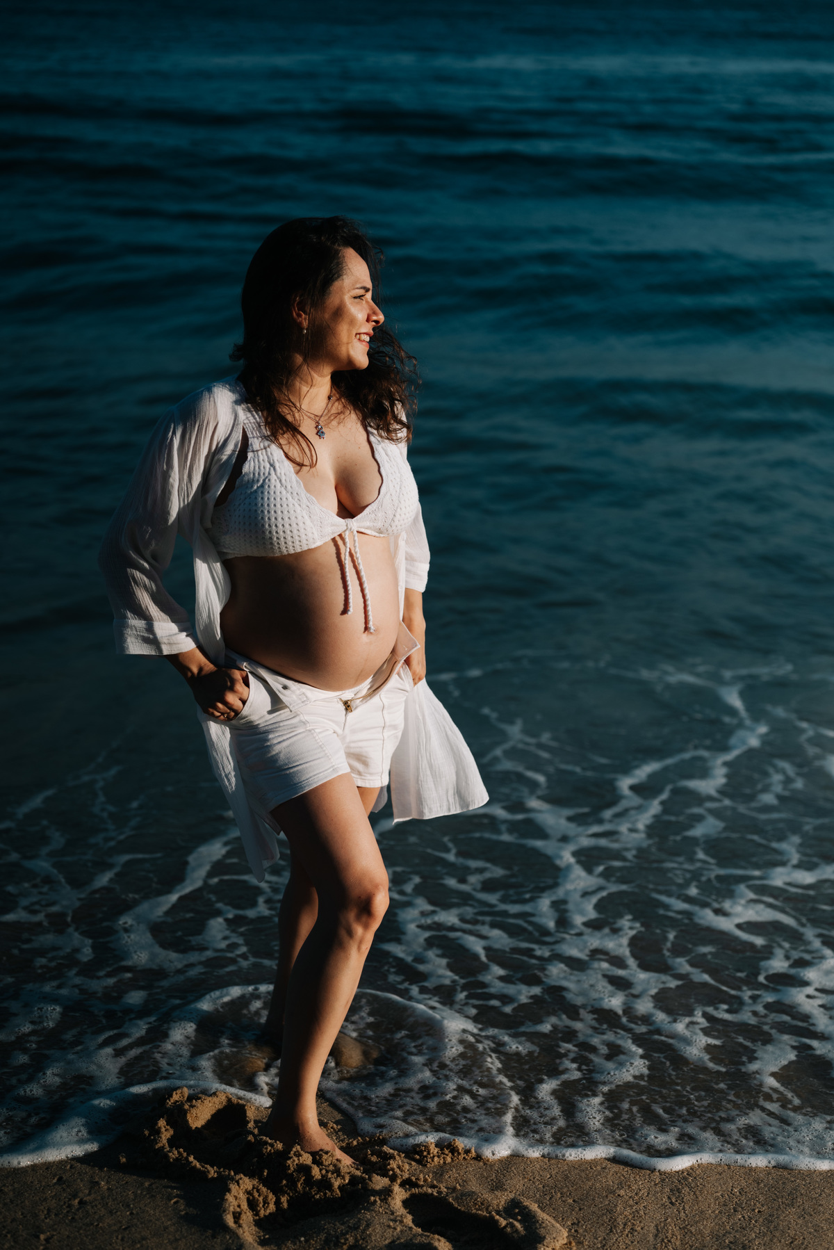Esse ensaio gestante na praia em Boiçucanga foi realizado no final da tarde, aproveitando a luz do pôr do sol — mais suave, quente e ideal para fotos ao ar livre.