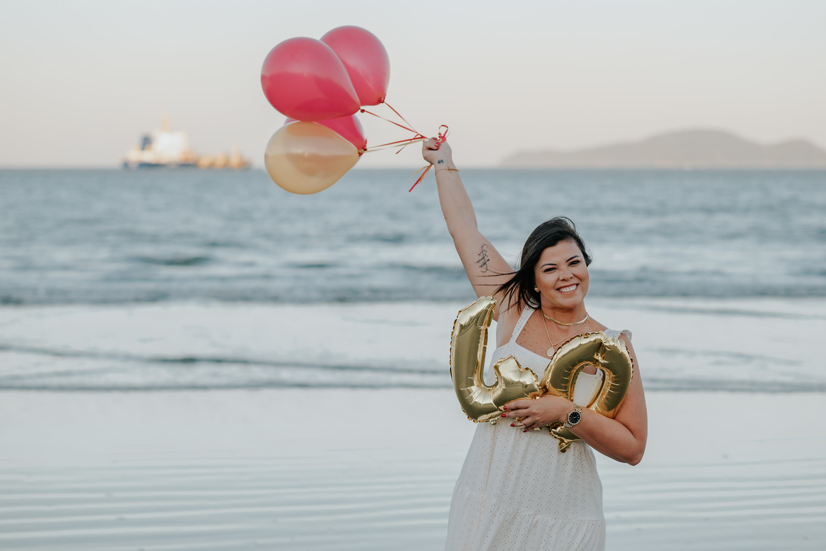 A definição do local para o ensaio fotográfico é uma missão bem difícil, no caso da Sheila, as fotos na praia com balões era algo indispensável, assim como as fotos com seu marido e o bolo para marcar a data tão esperada. Definimos então fazer as fotos na praia, em Santos ( litoral de SP) e em seu apartamento, dessa forma abrangemos os critérios importantes e o registro ficou bem completinho.