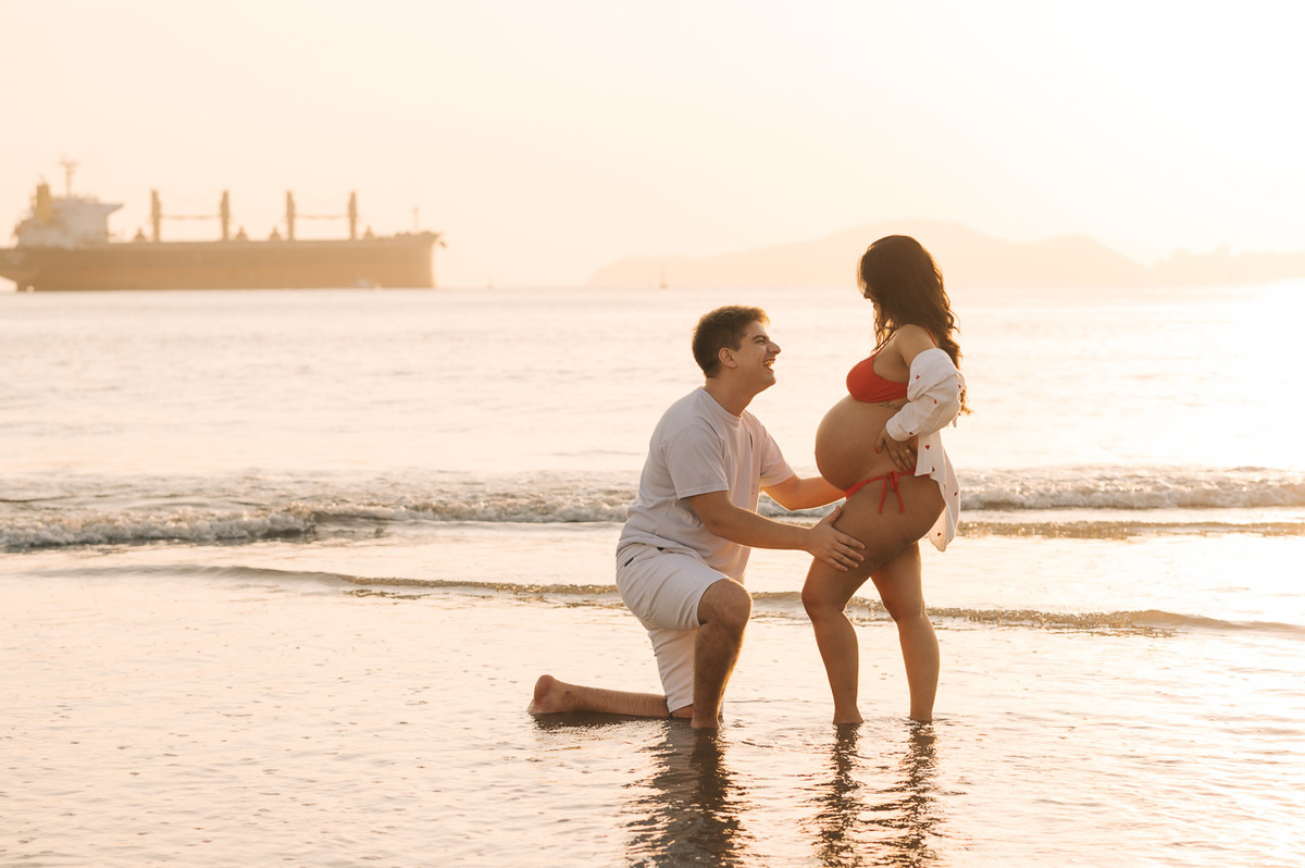 A Bia já tinha garantido as fotos da Carolina no forninho lá no estúdio, mas a vontade do casal era ter os registros da gestação na praia. A Bia estava na dúvida se faria, desanimou porque a previsão do tempo não era a melhor .... mas conversamos e que bom que eles decidiram fazer a sessão de fotos da gravidez na praia =) A ideia inicial era fazer na mesma praia do pre Wedding, mas como ela já estava com 36 semanas, a melhor escolha foi fazer em Santos, afinal aqui na cidade também tem muitas memórias afetivas e fez todo sentido e conforto ( o principal).