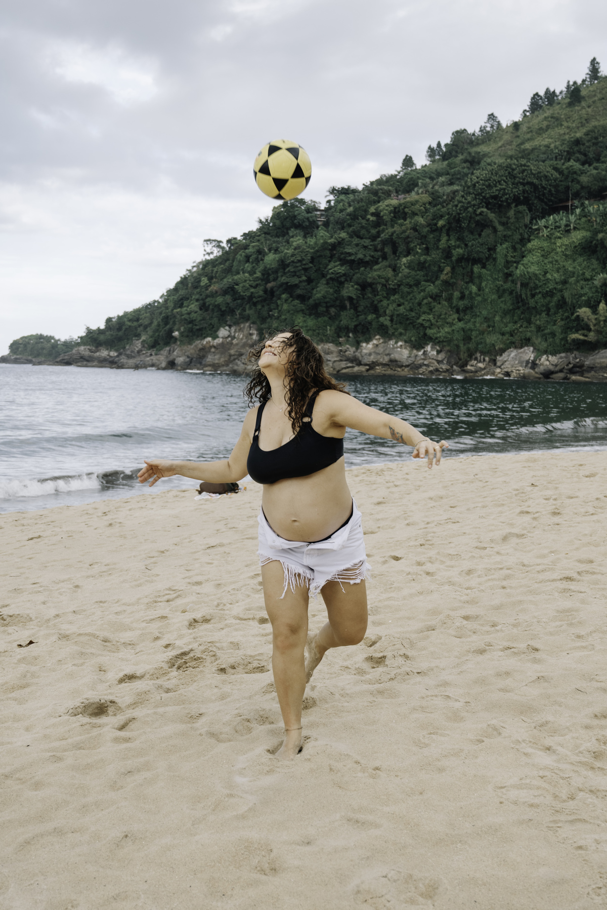 Fiz um bate papo com eles para entender cada detalhe do que estavam buscando e planejamos incluir futvôlei durante o ensaio gestante na praia. O resultado ficou sensacional.