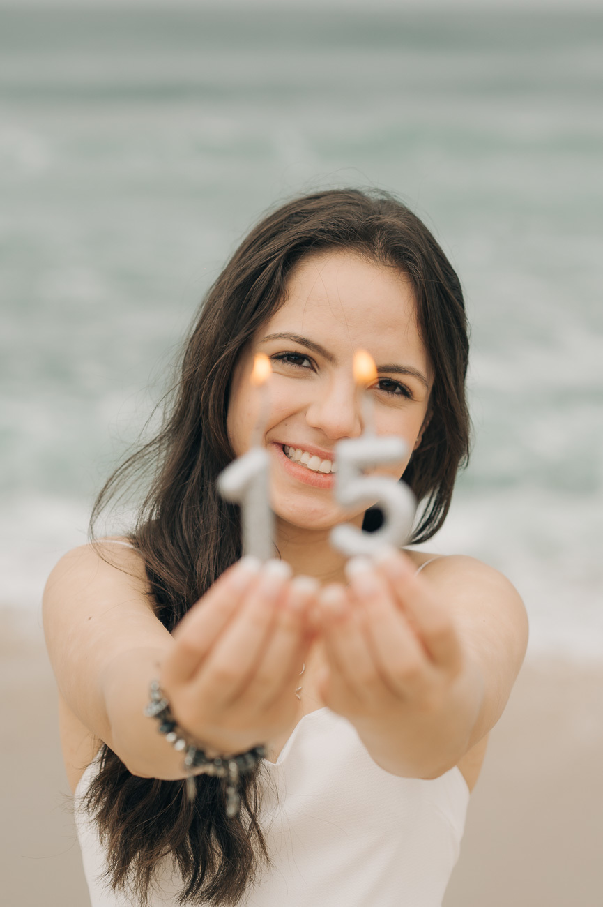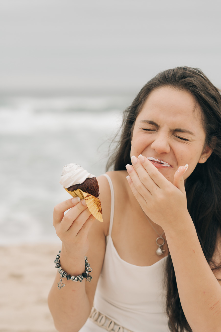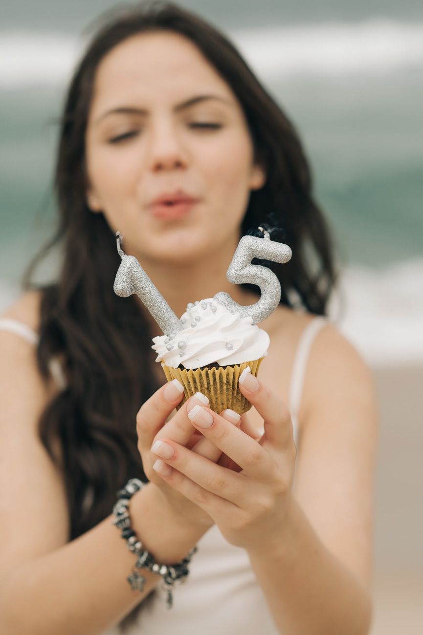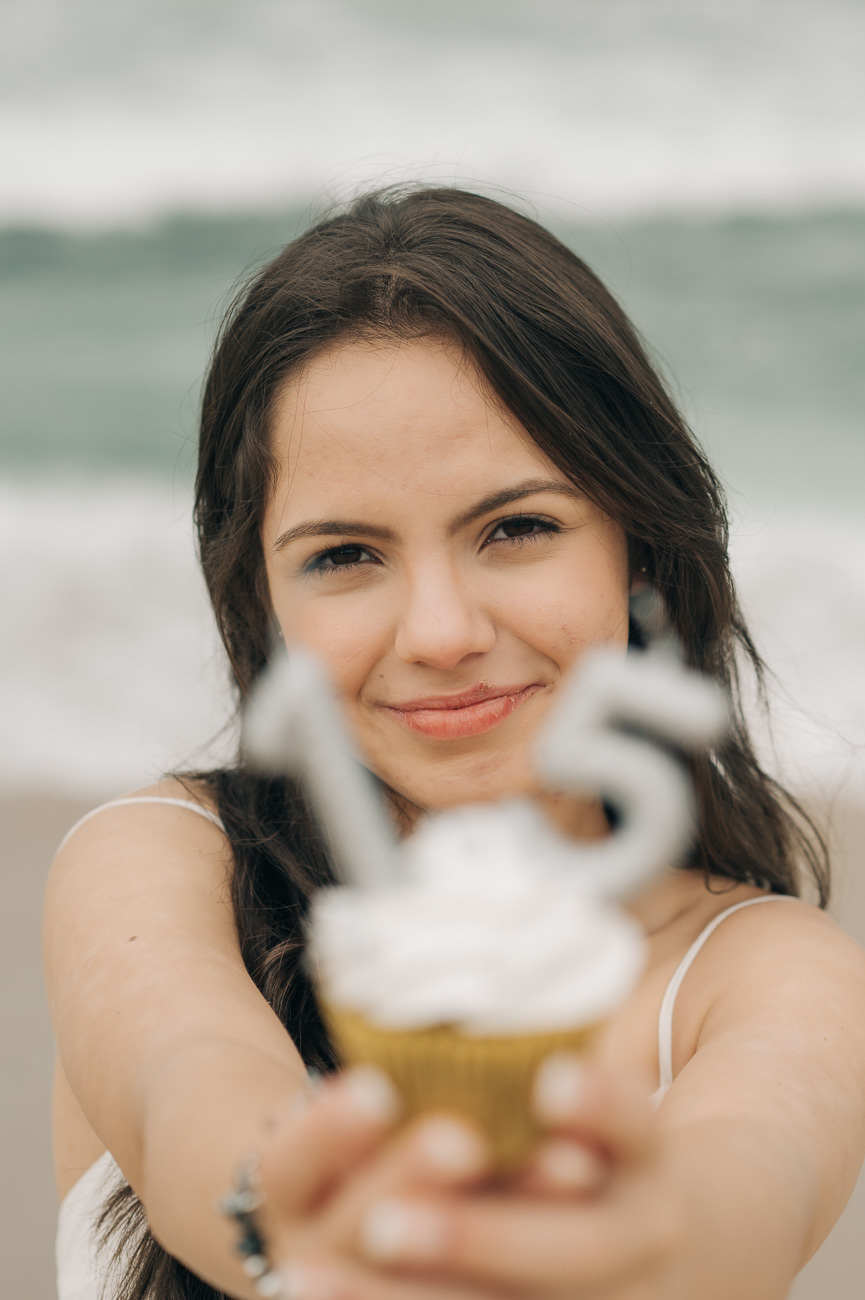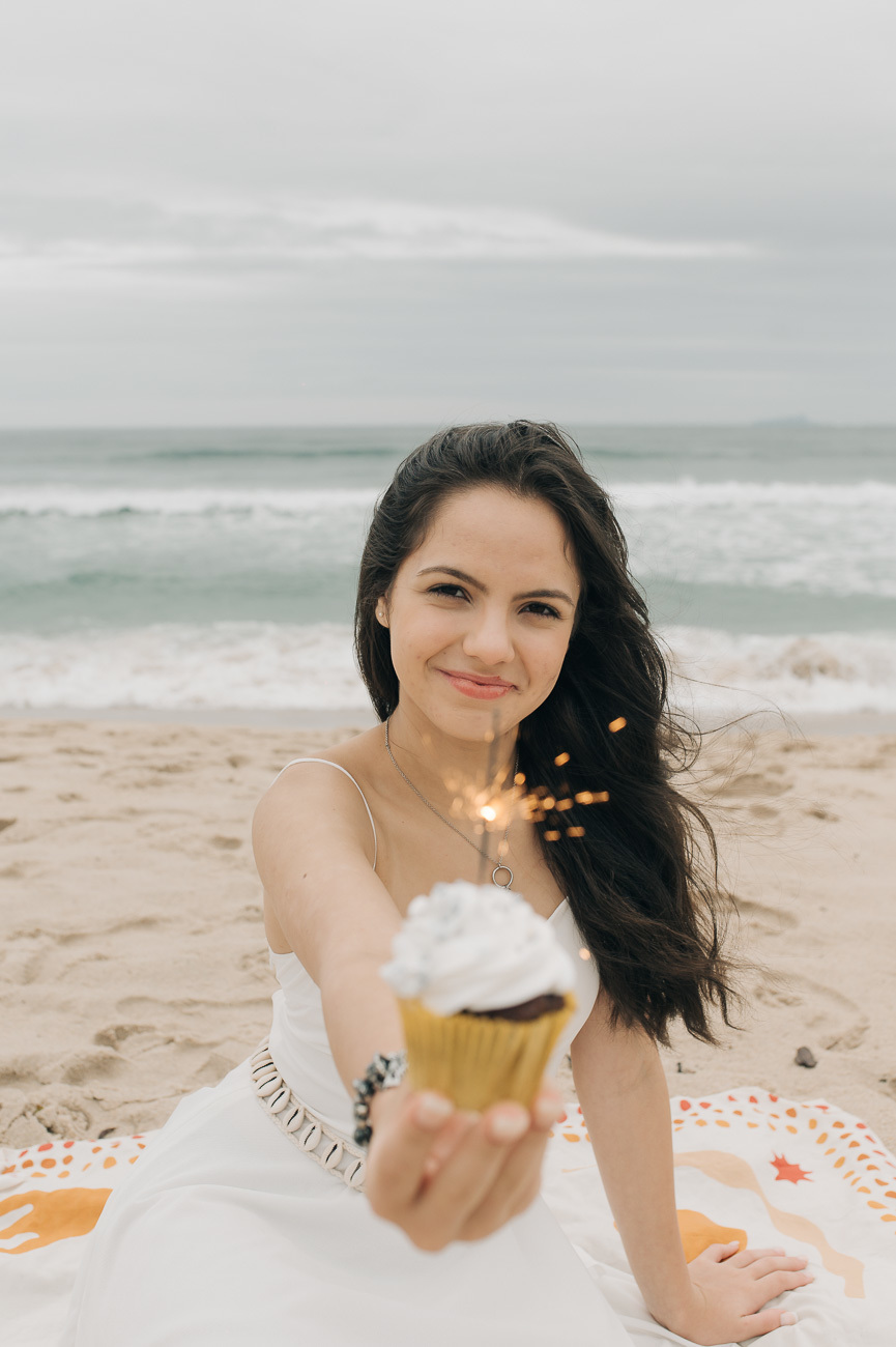 A praia de Maresias, São Sebastião, foi o cenário perfeito para comemorar tanto seu aniversário como a sessão de fotos de 15 anos. Um ensaio na praia leve, divertido com muitas de risos, com direito a se lambuzar com seu cupcake.