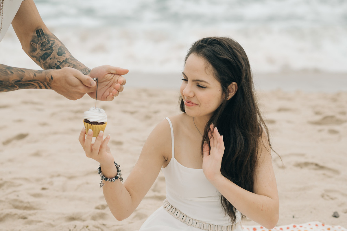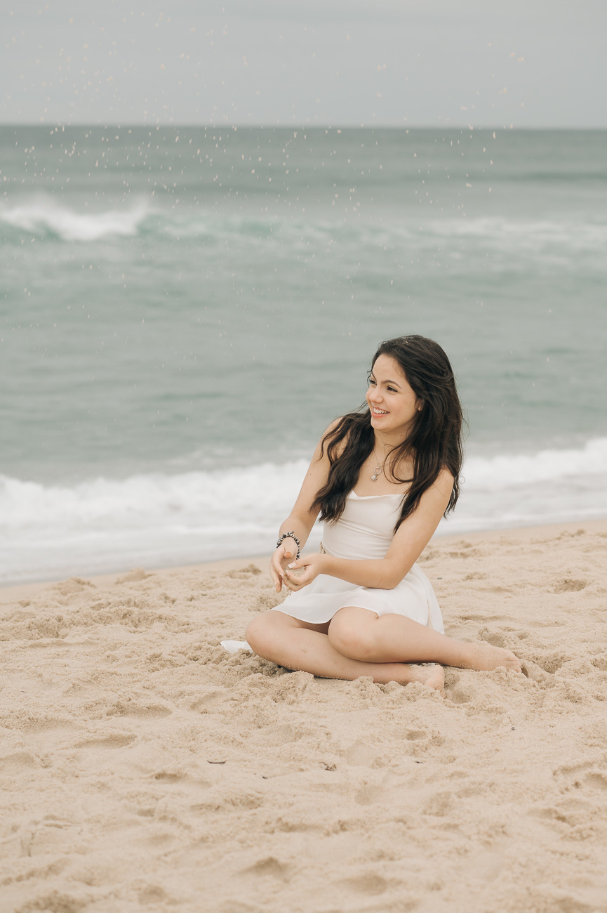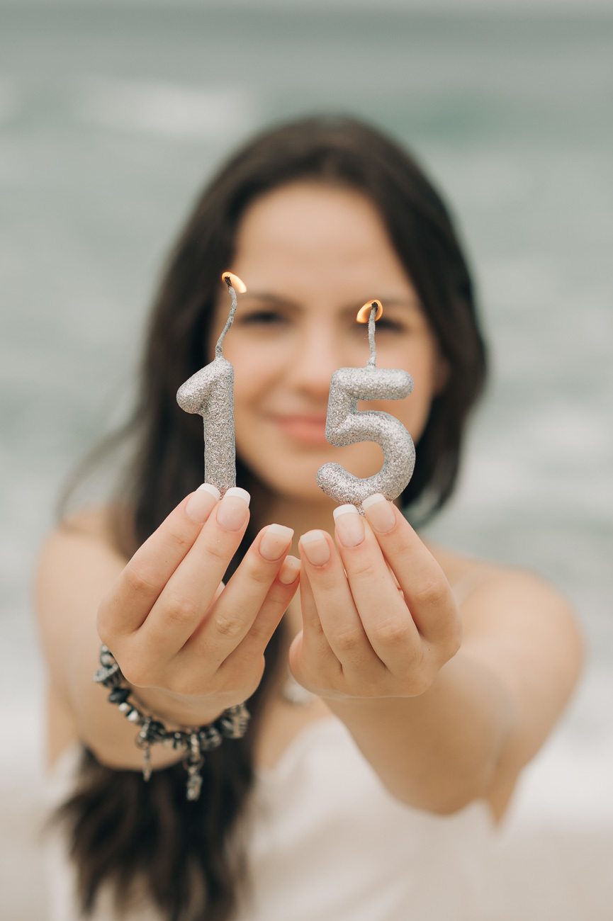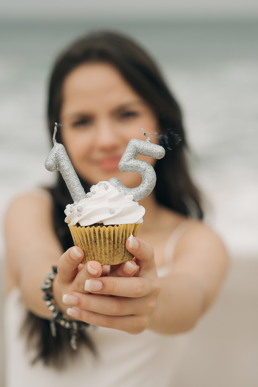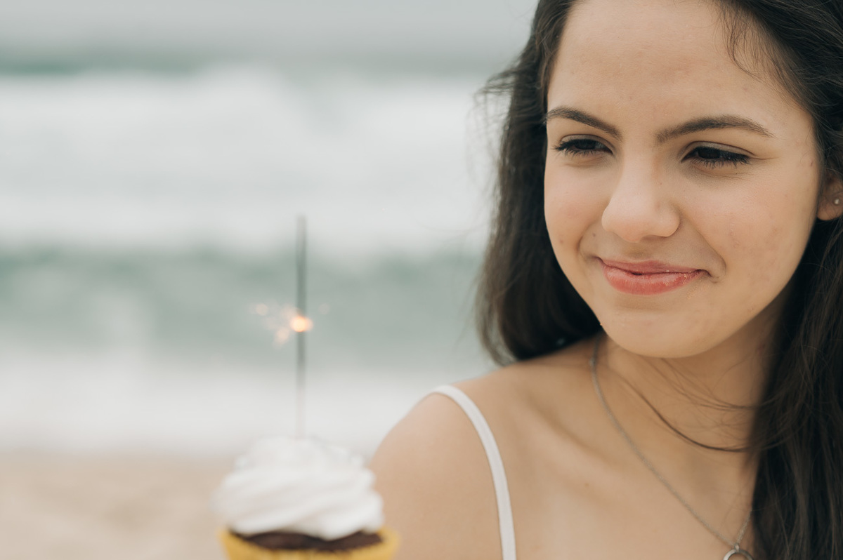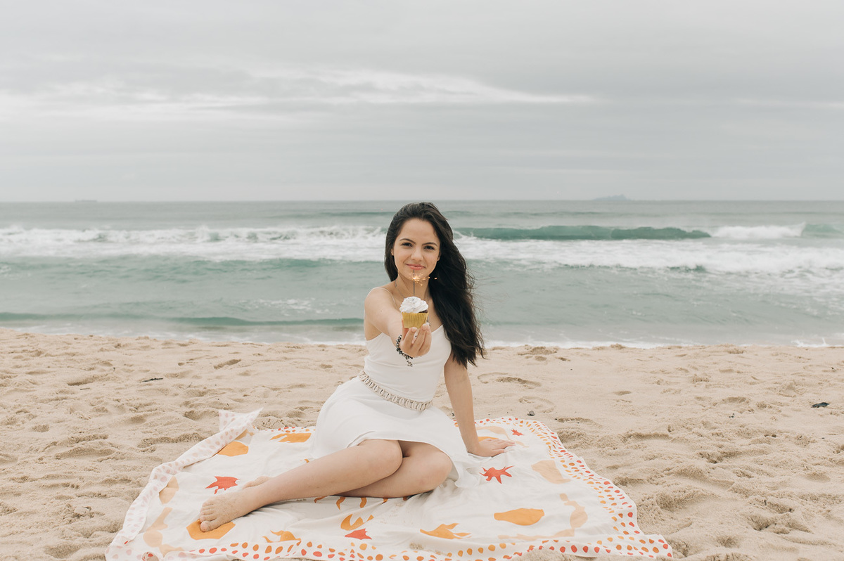 A praia de Maresias, São Sebastião, foi o cenário perfeito para comemorar tanto seu aniversário como a sessão de fotos de 15 anos. Um ensaio na praia leve, divertido com muitas de risos, com direito a se lambuzar com seu cupcake.