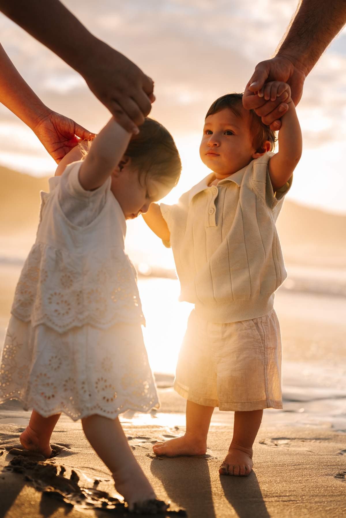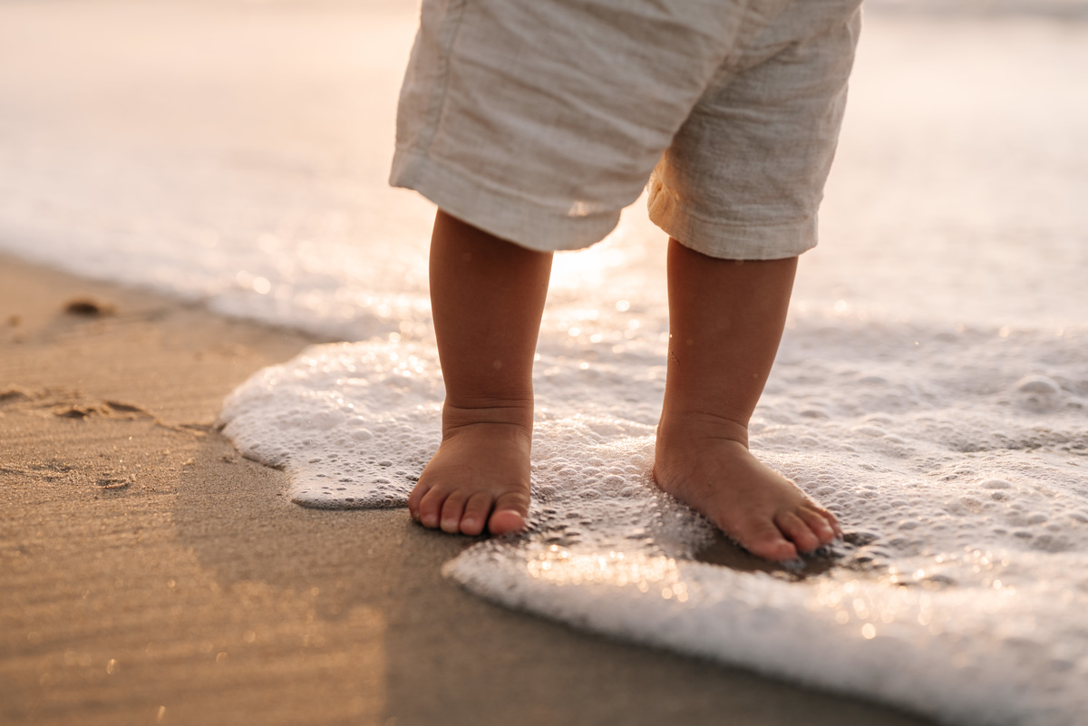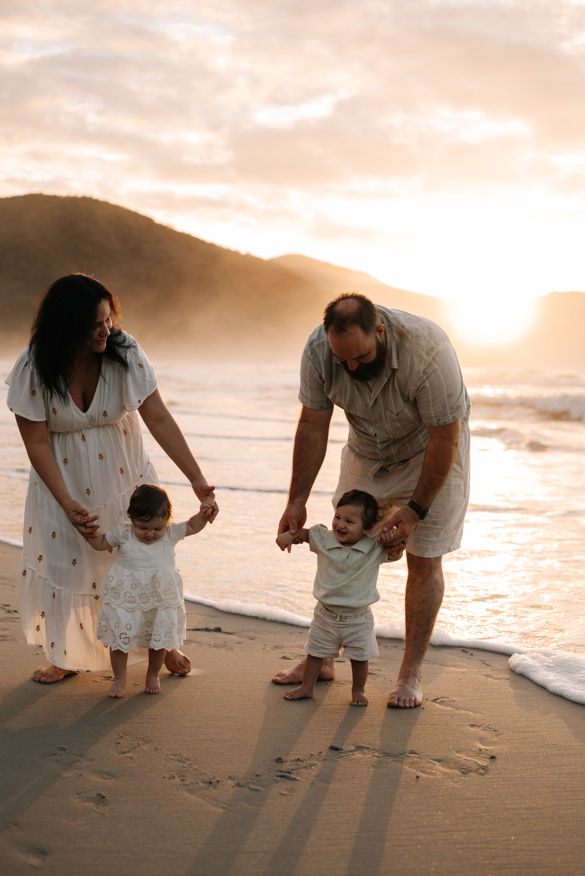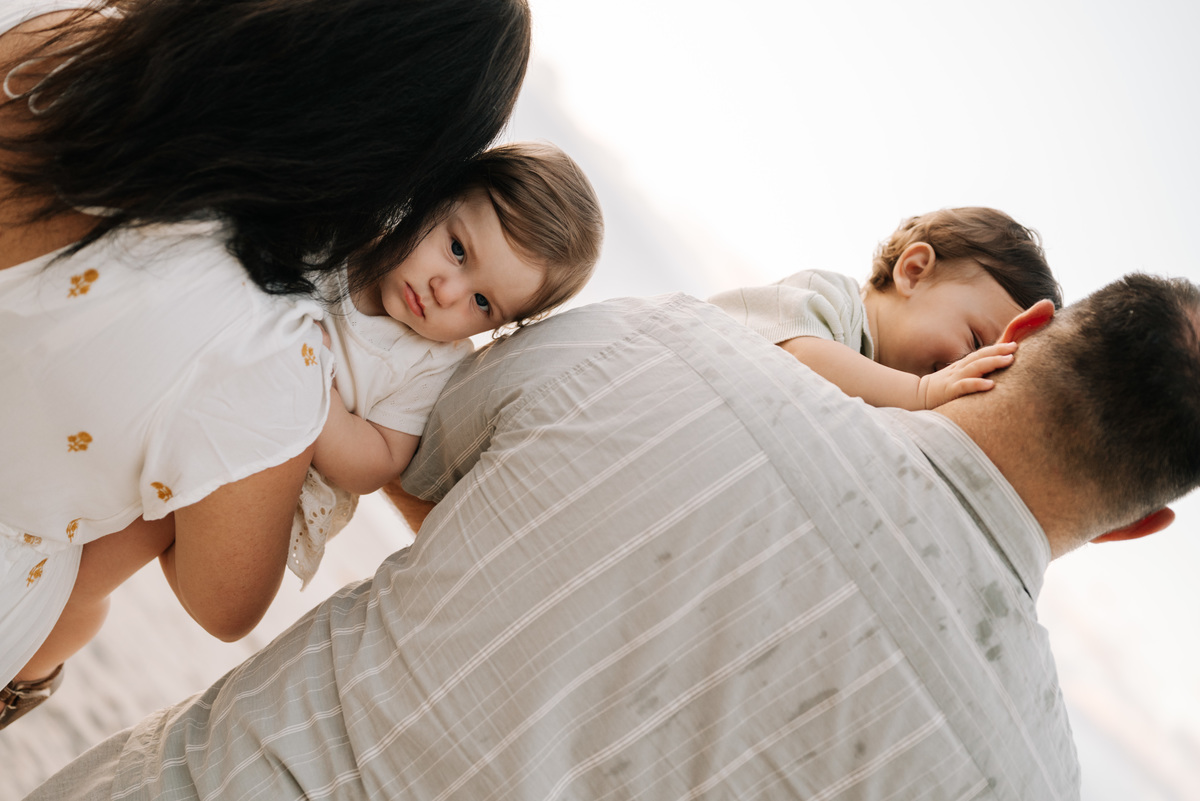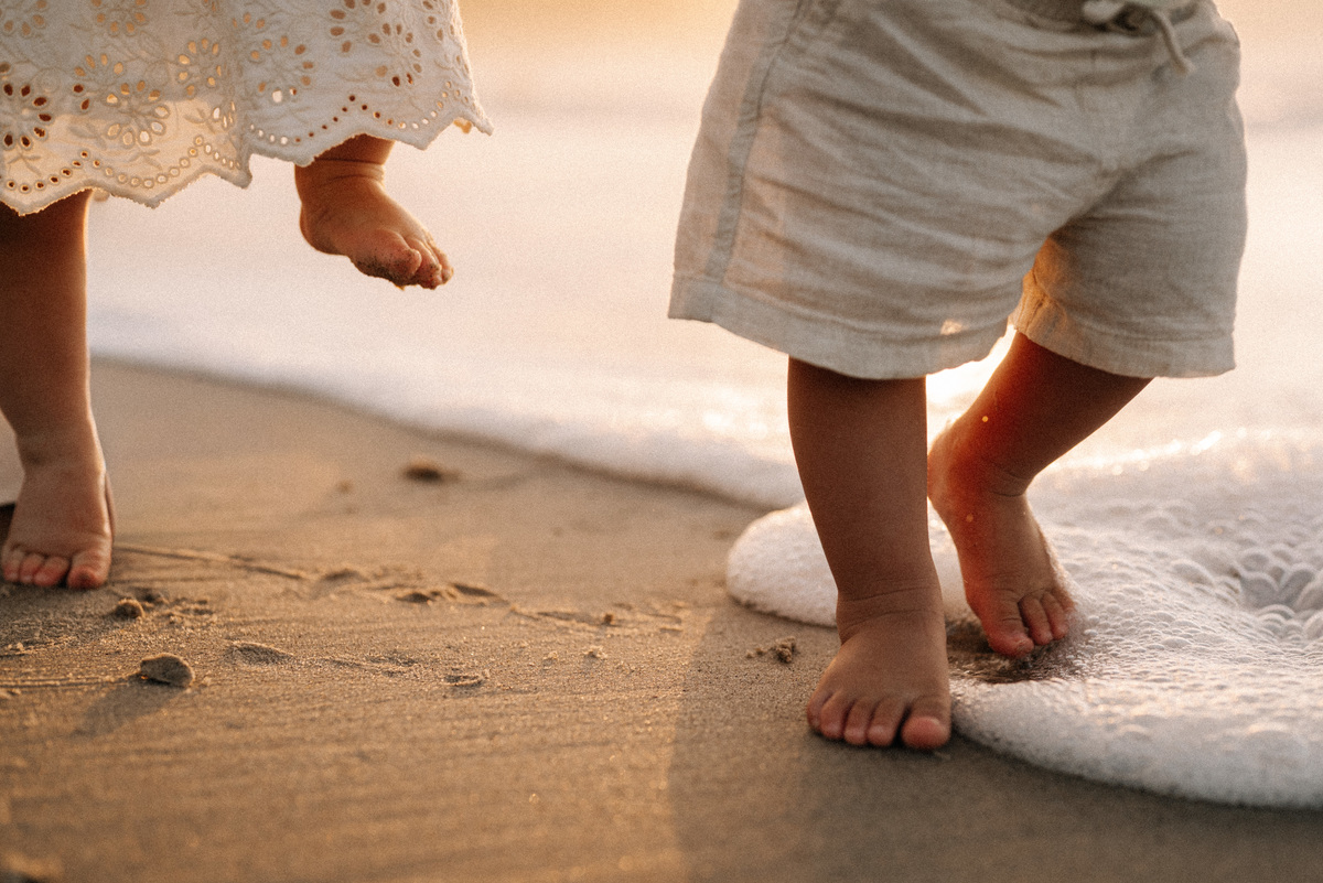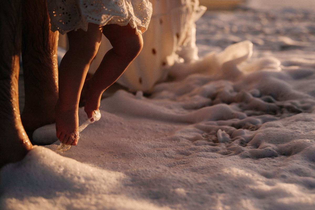 O amanhecer é um dos horários mais especiais para fotografar famílias. As crianças chegam mais dispostas, o clima é agradável e a praia está mais reservada. Isso permite que o ensaio aconteça de forma leve, sem pressa, respeitando o ritmo de cada um.