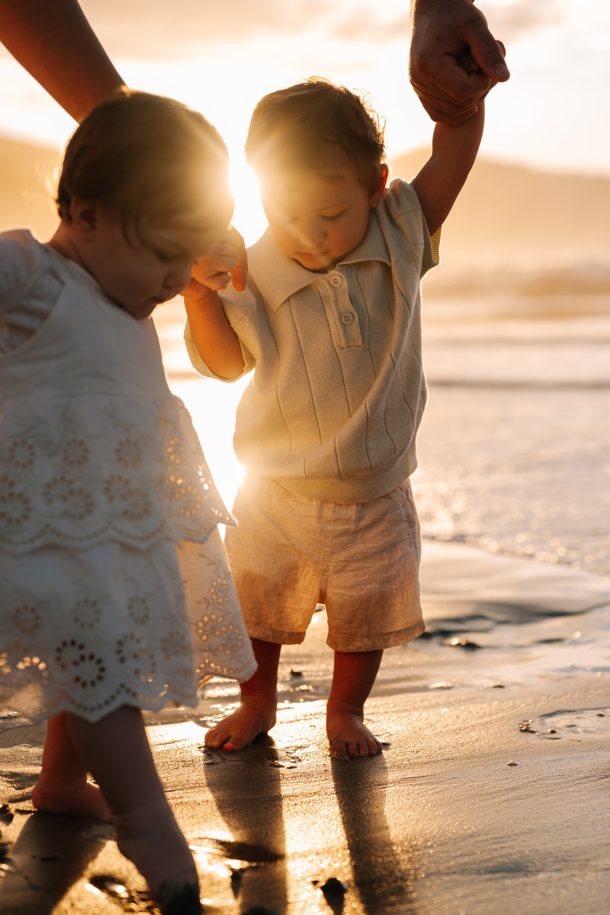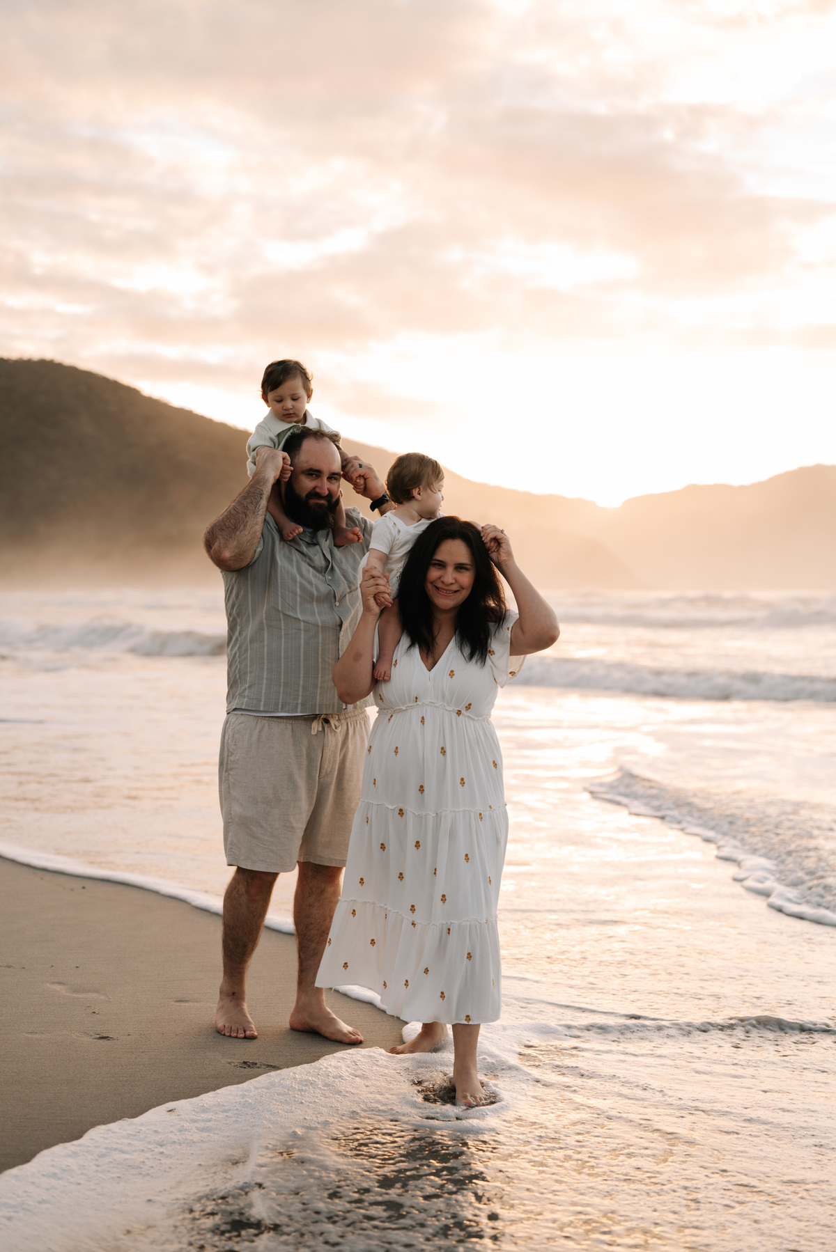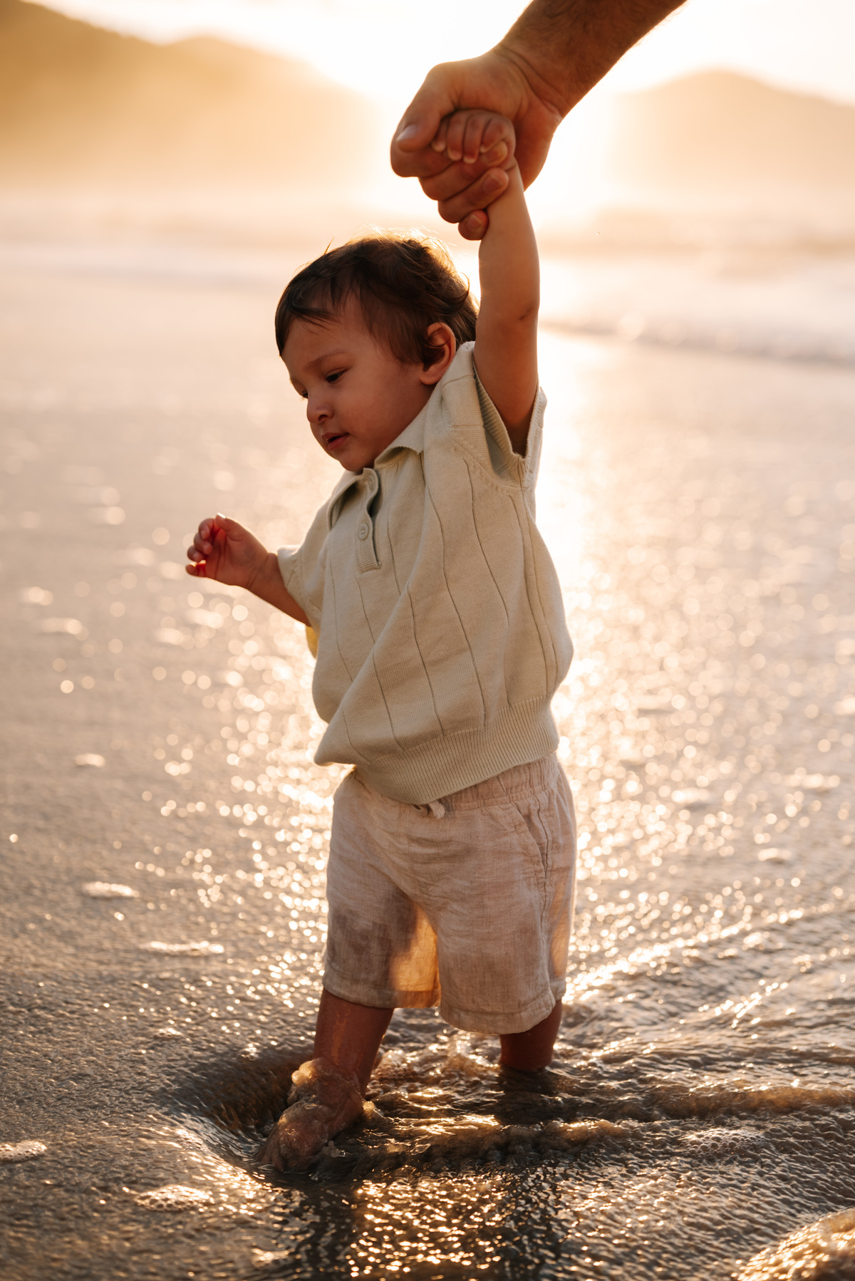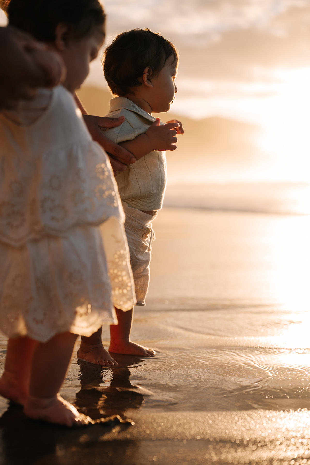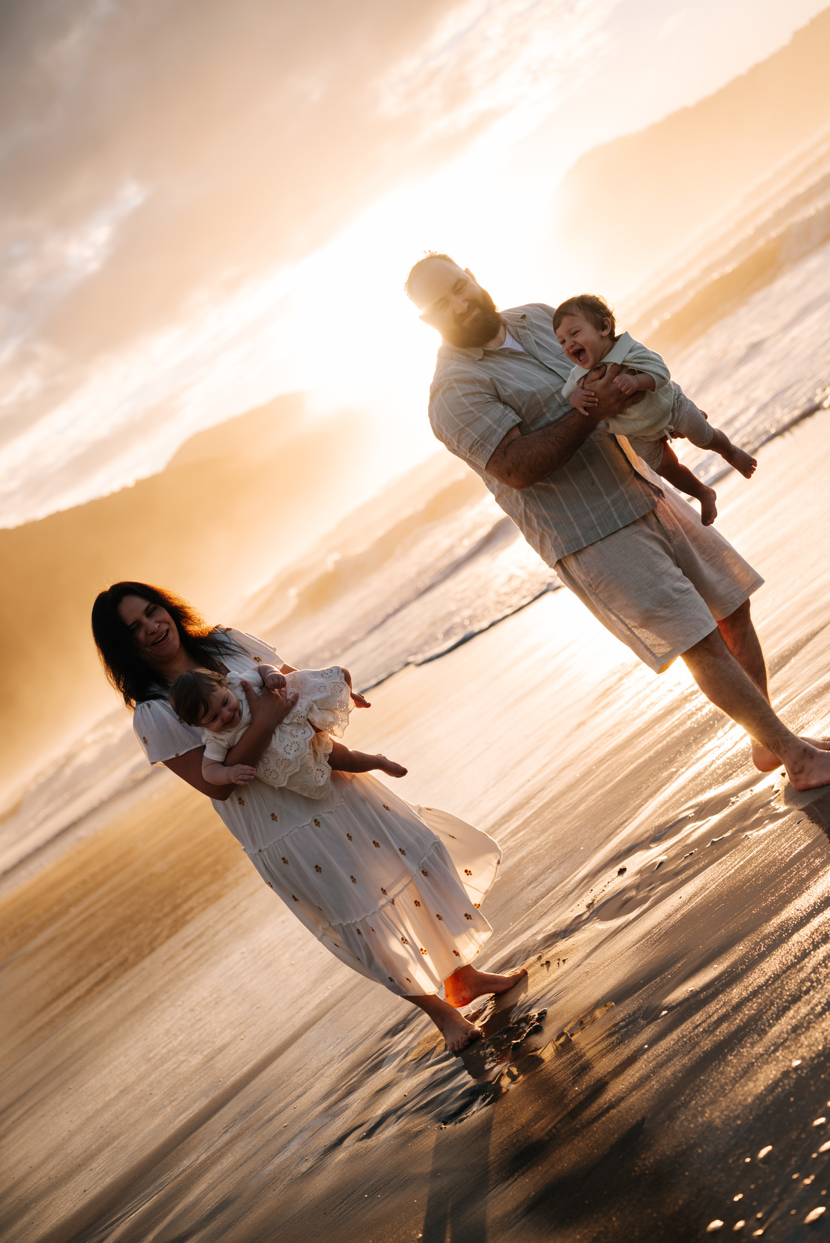 O amanhecer é um dos horários mais especiais para fotografar famílias. As crianças chegam mais dispostas, o clima é agradável e a praia está mais reservada. Isso permite que o ensaio aconteça de forma leve, sem pressa, respeitando o ritmo de cada um.
