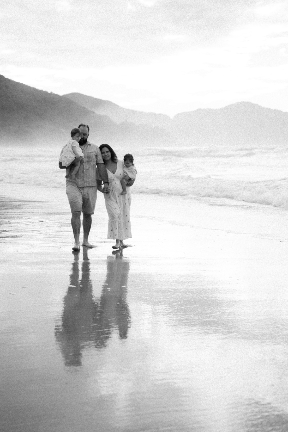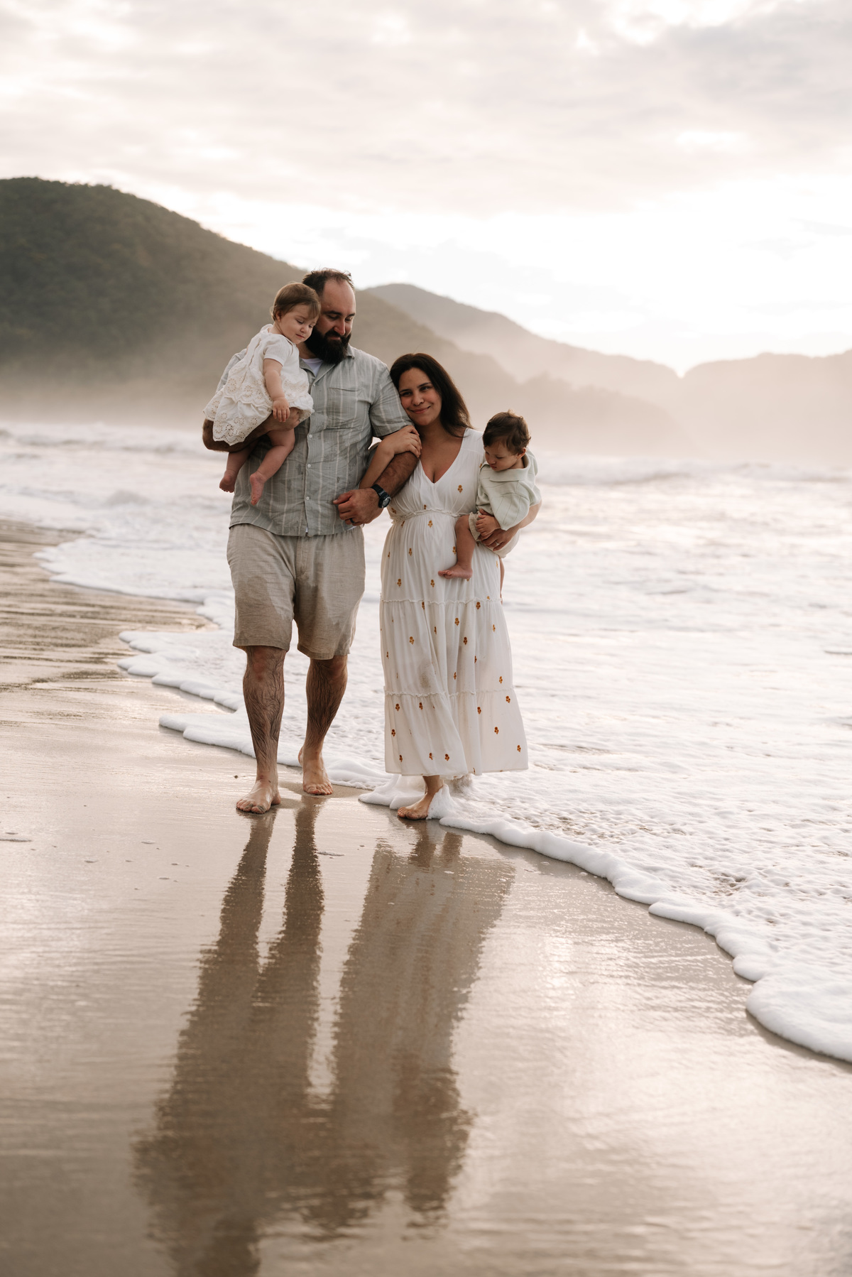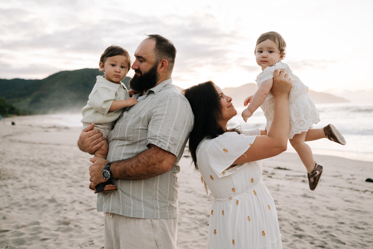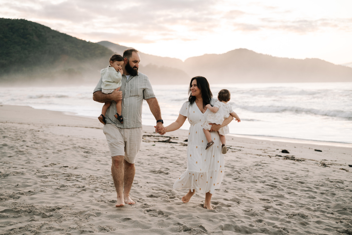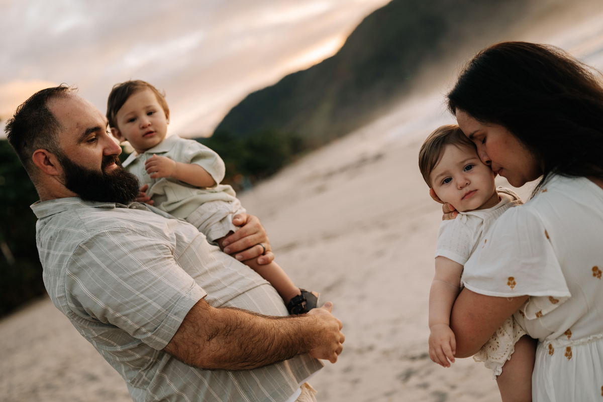 O ensaio família em Camburi, na praia de São Sebastião, tem uma energia única — especialmente quando acontece no amanhecer.
