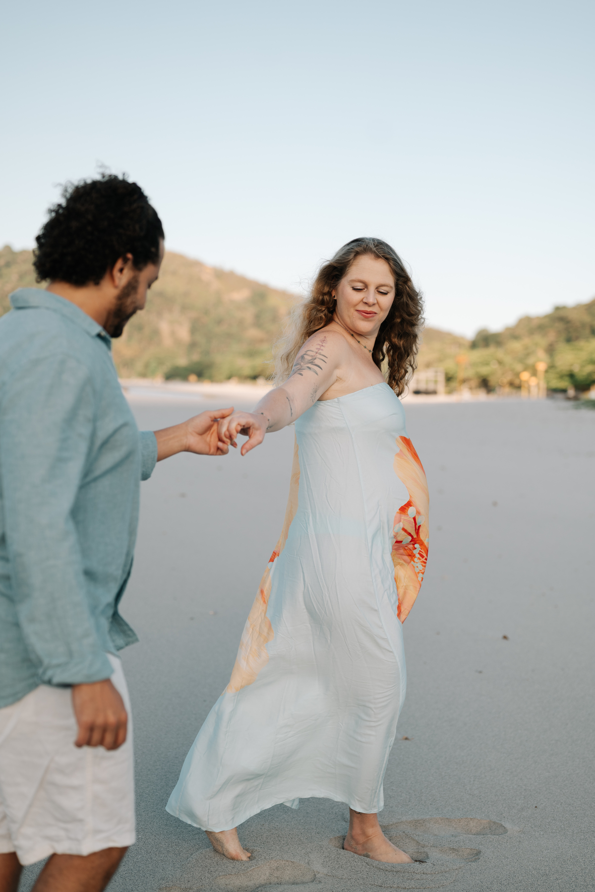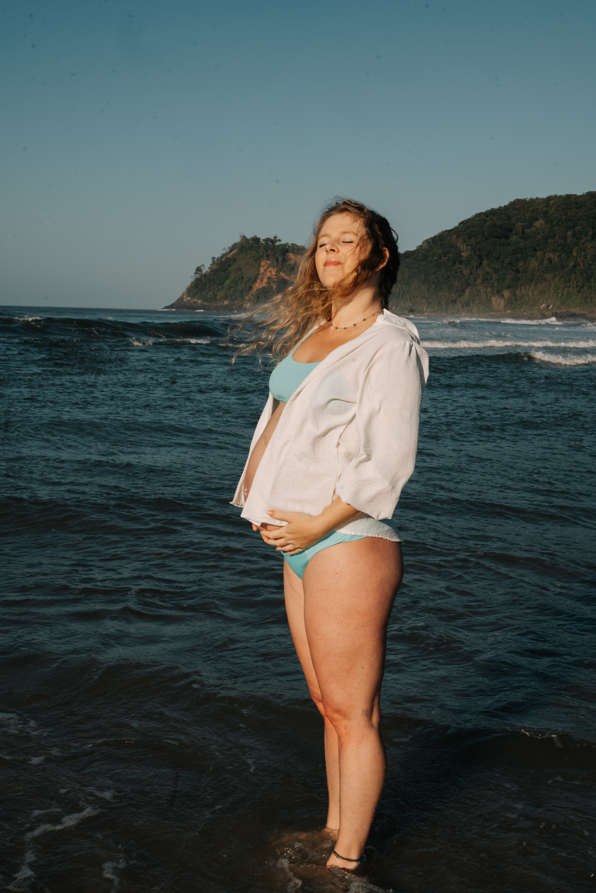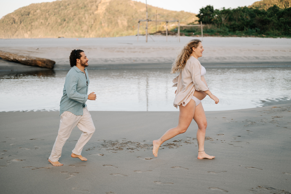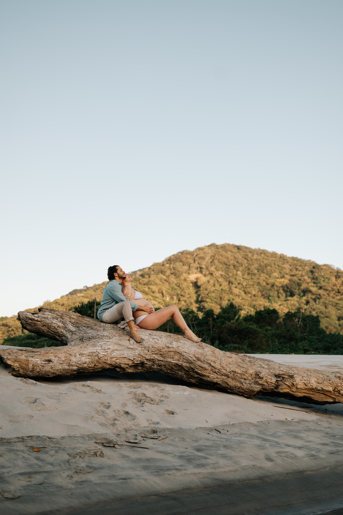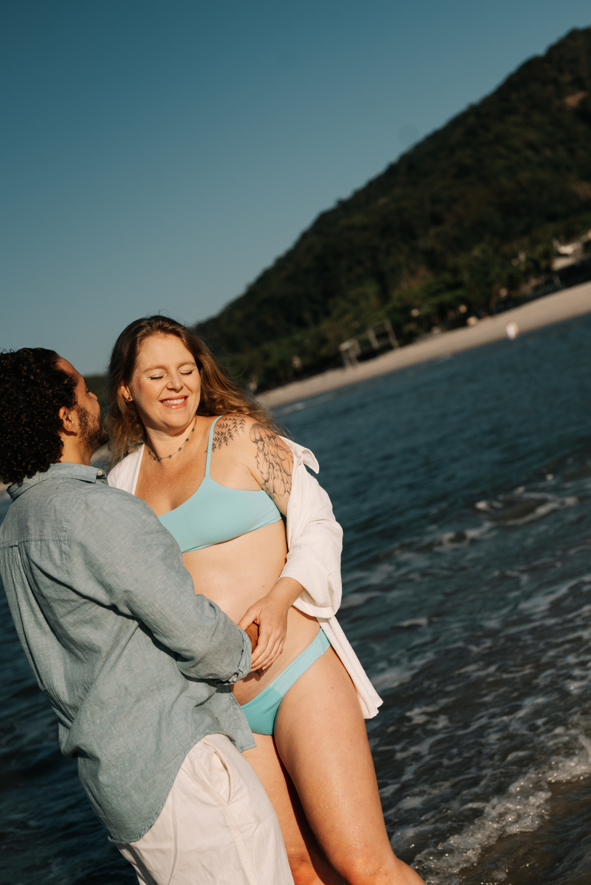E foi assim que planejamos um **ensaio gestante na praia de São Sebastião**, leve e espontâneo, com o sol, o mar e a conexão dos dois.