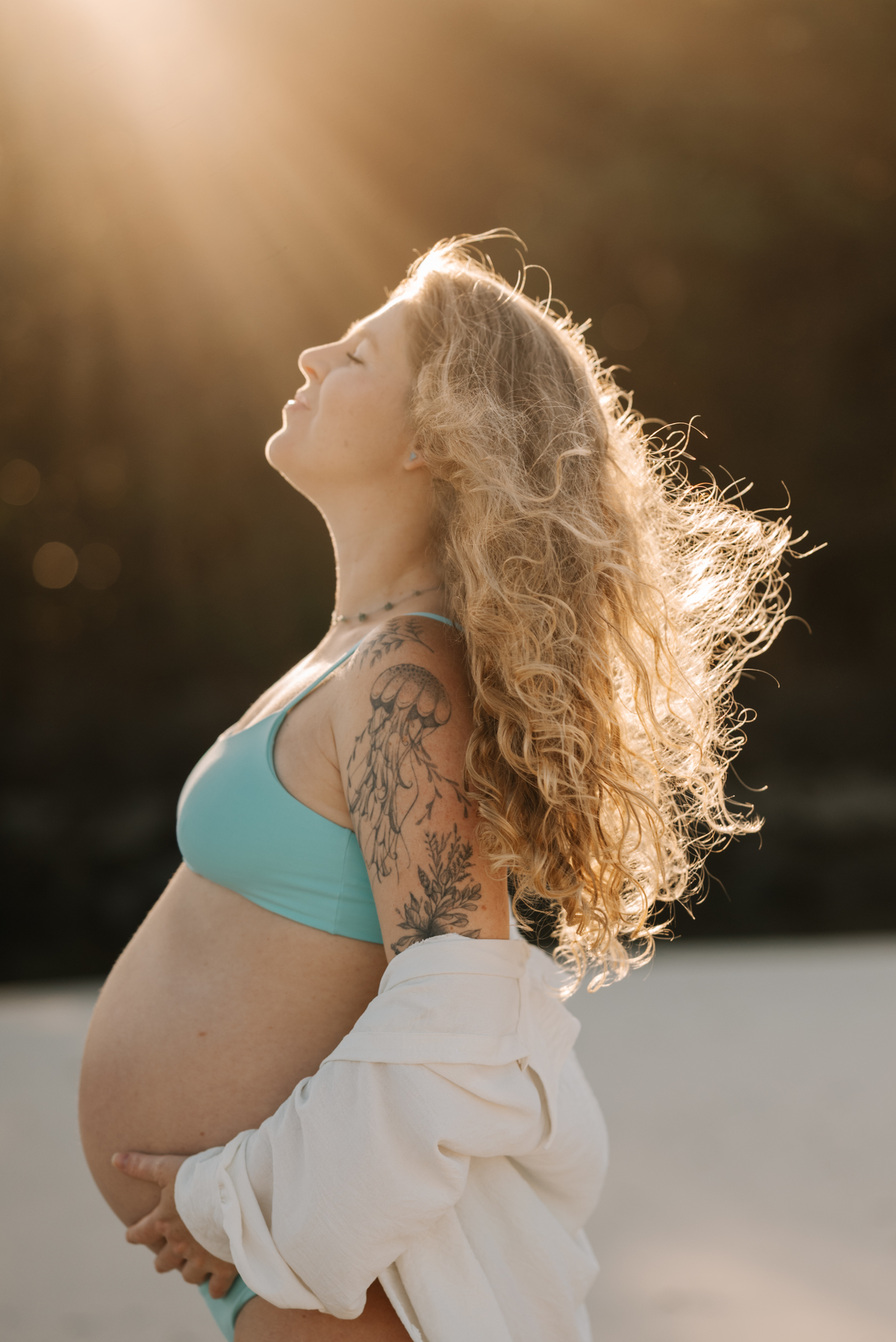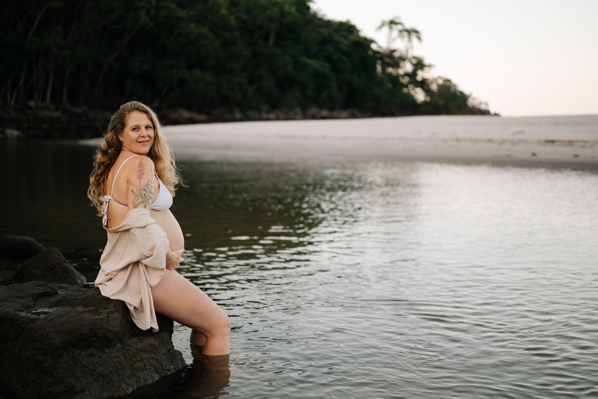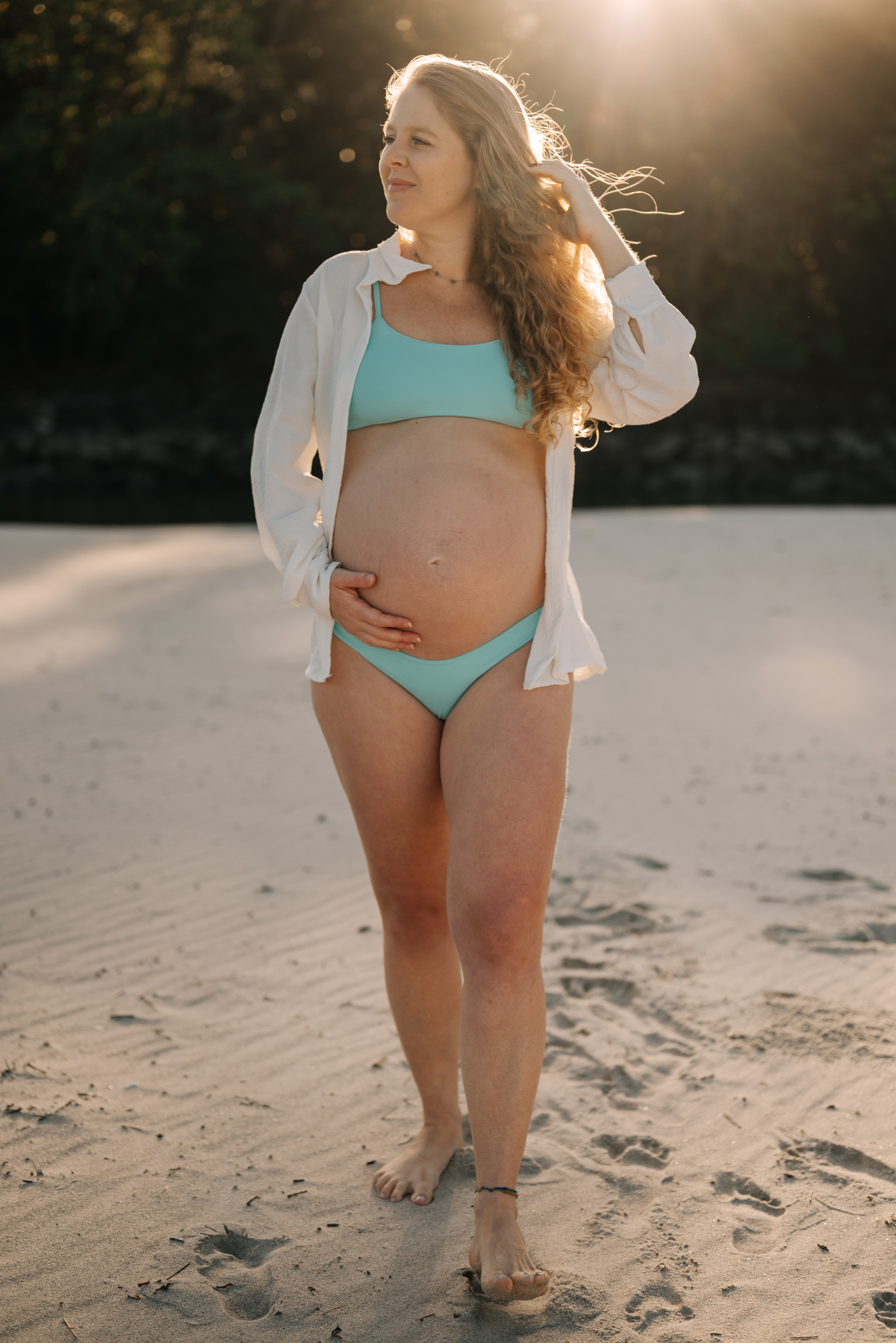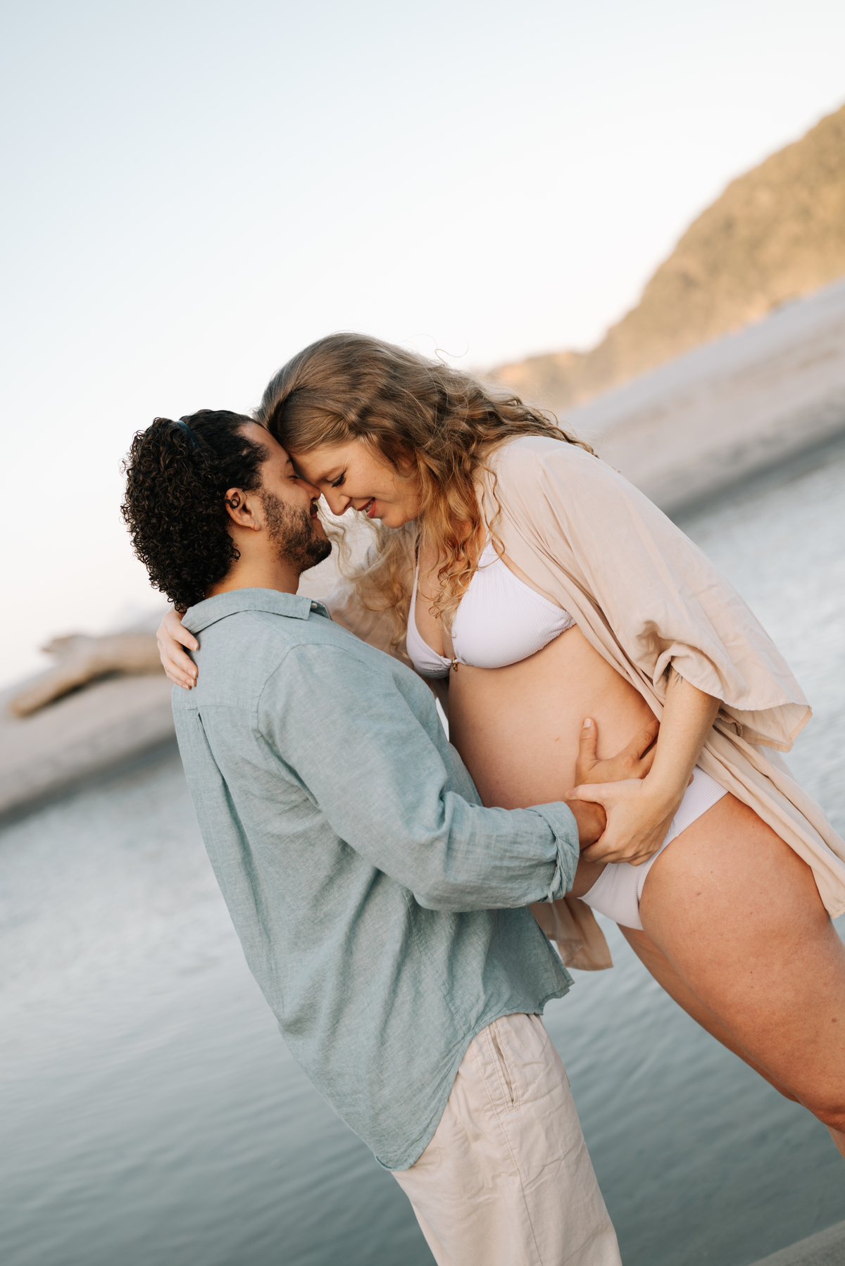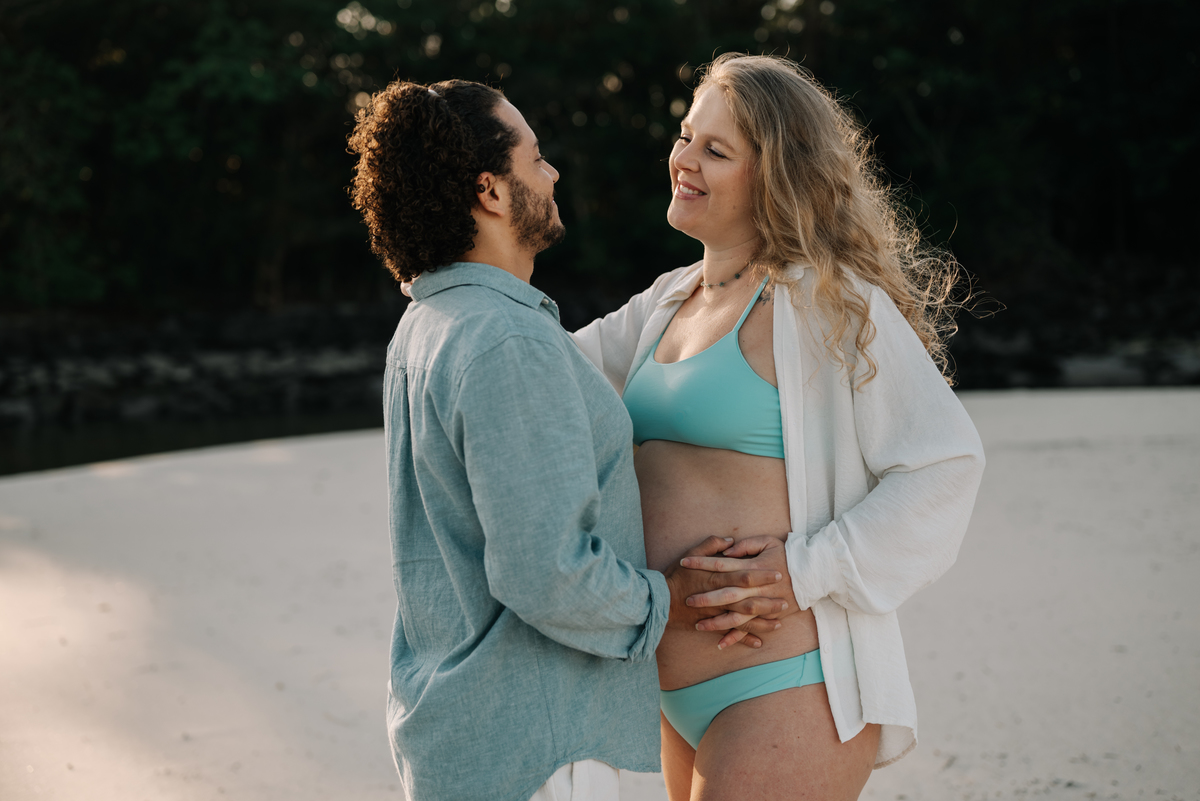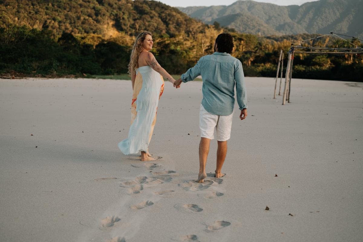 E foi assim que planejamos um **ensaio gestante na praia de São Sebastião**, leve e espontâneo, com o sol, o mar e a conexão dos dois.