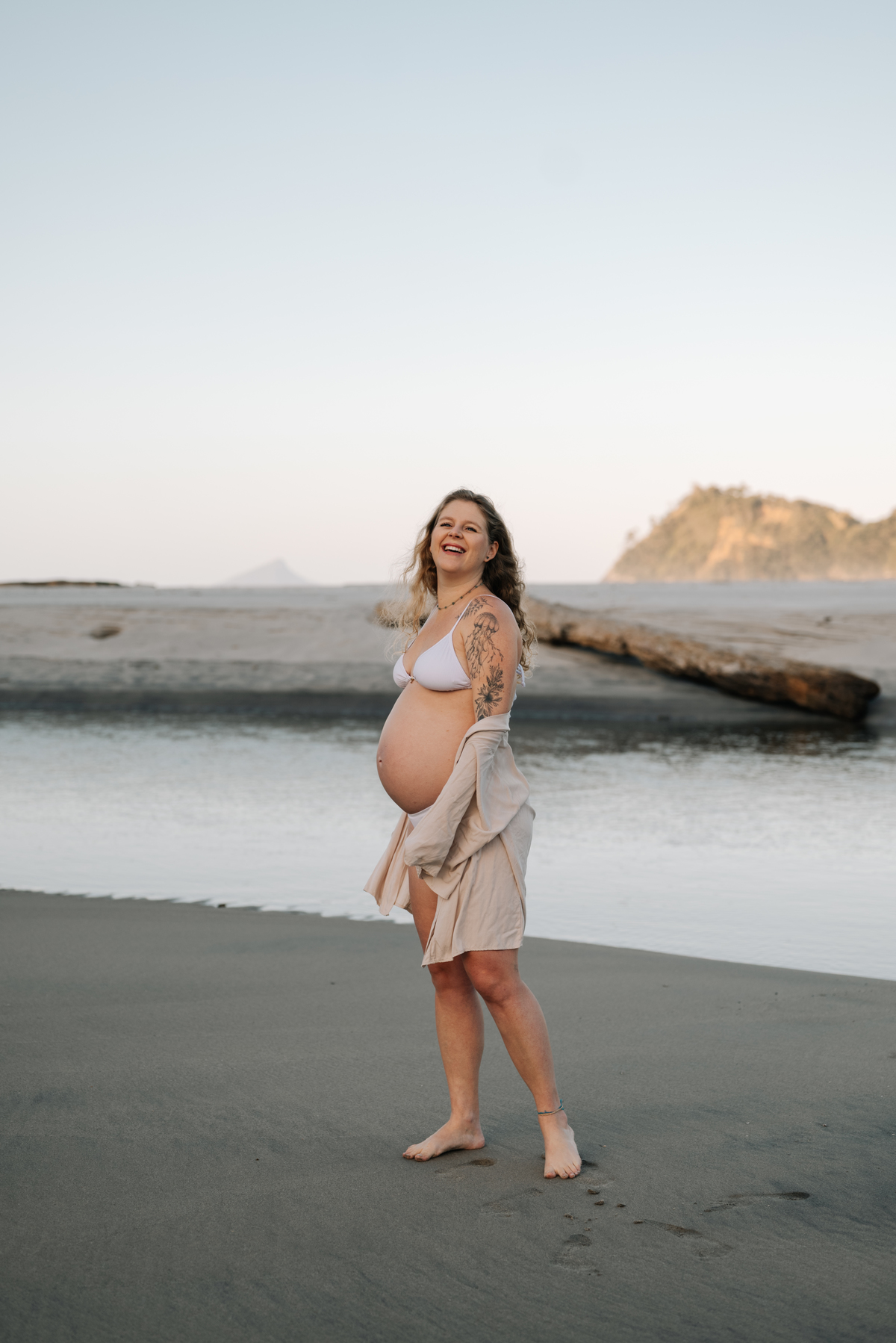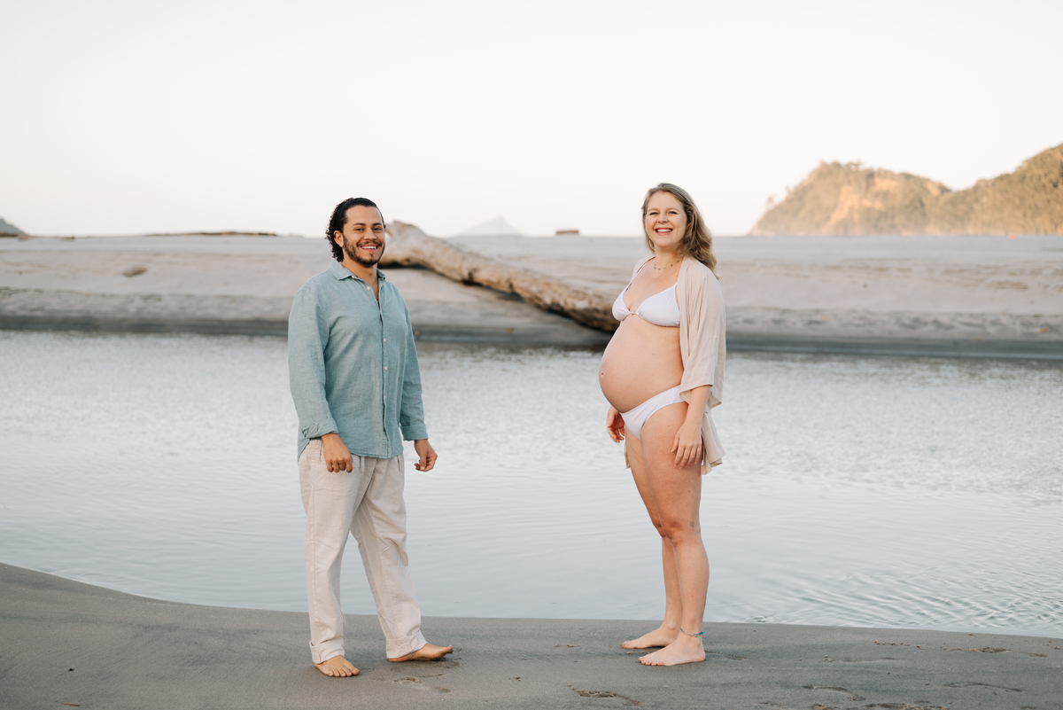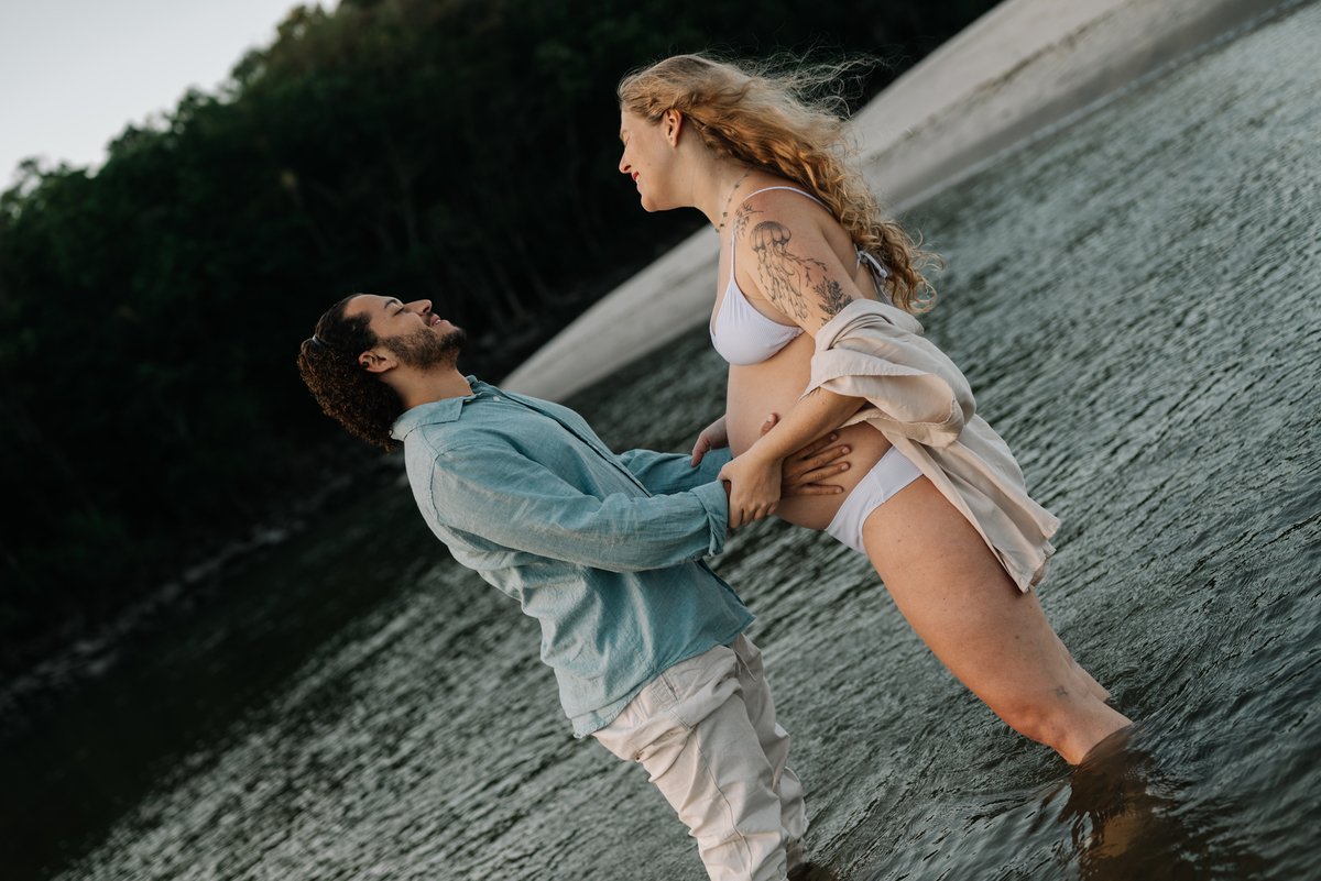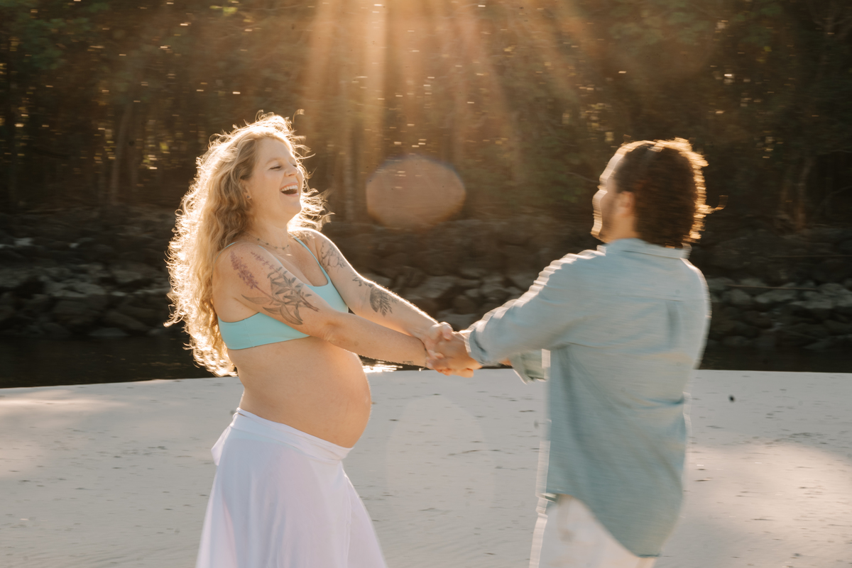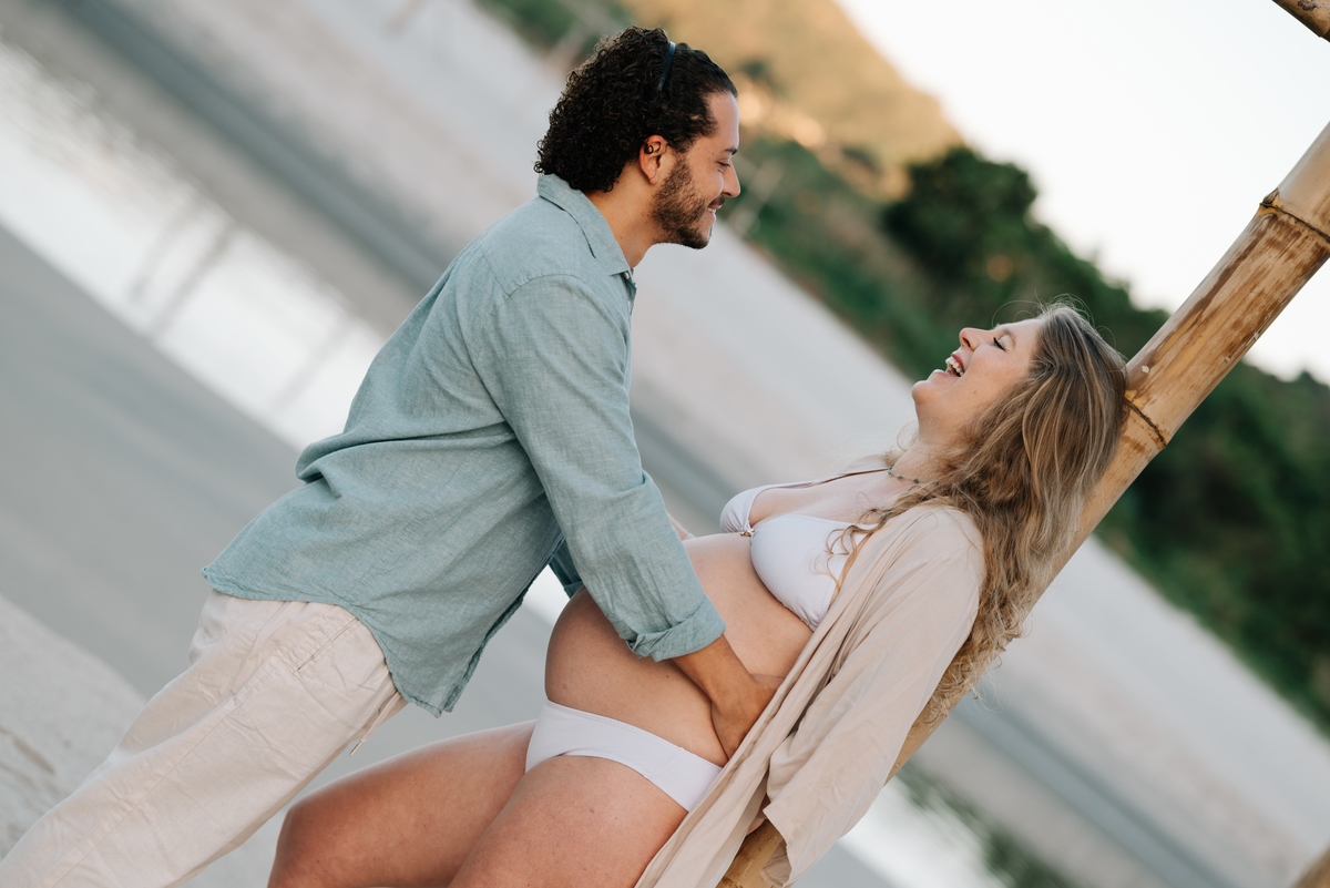 As risadas surgiram naturalmente, o movimento do mar trouxe tranquilidade, e aquele momento se transformou em uma lembrança linda da espera pela bebê.