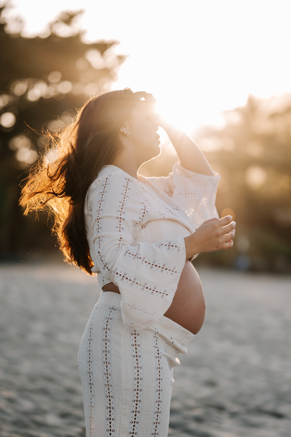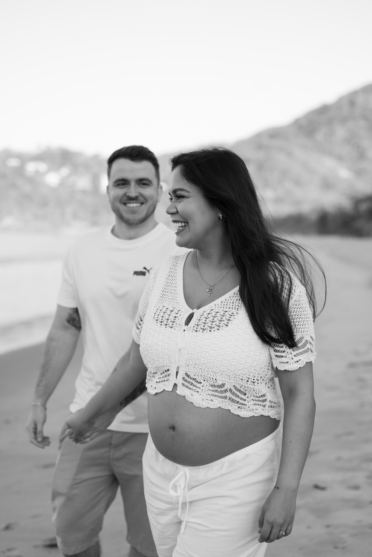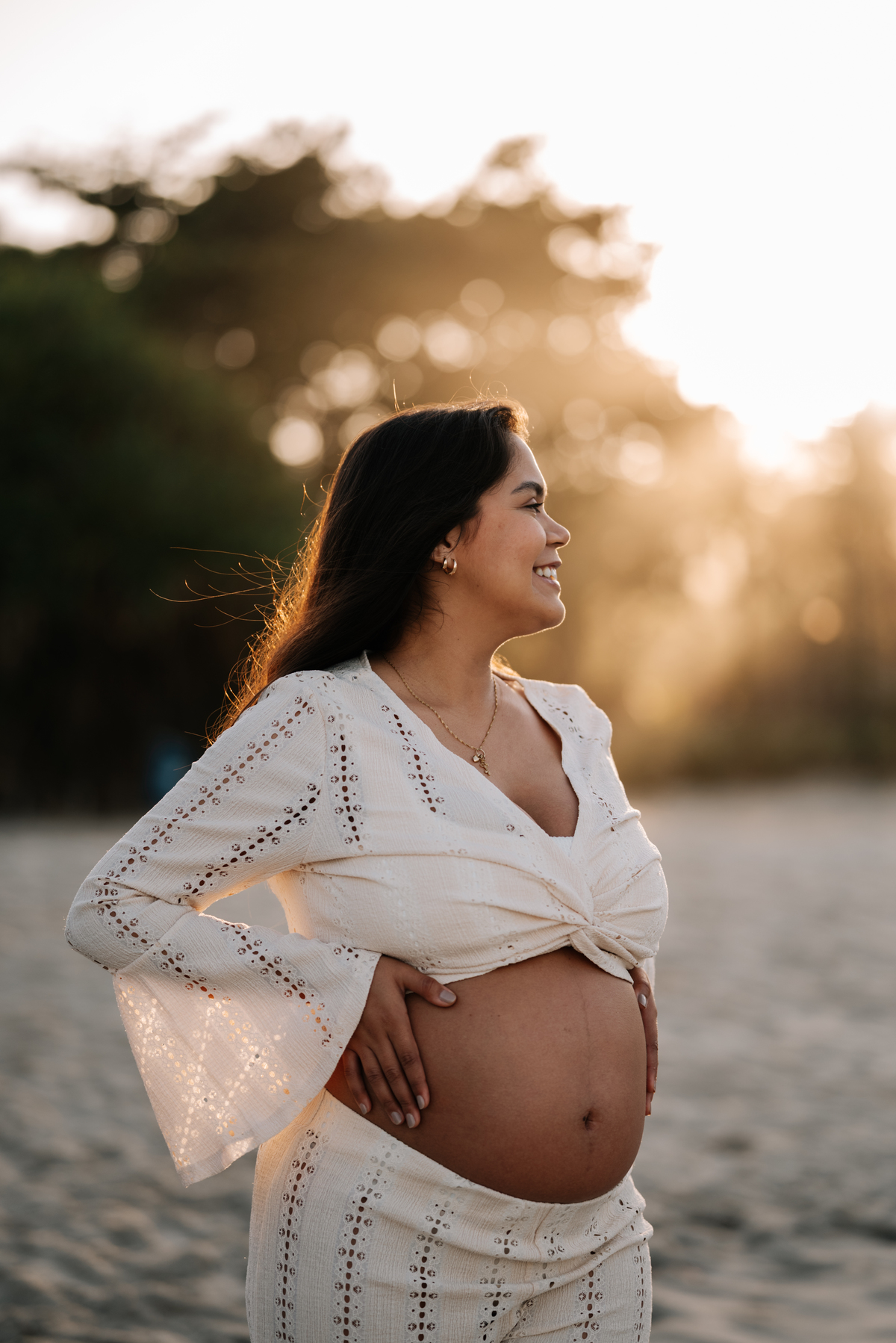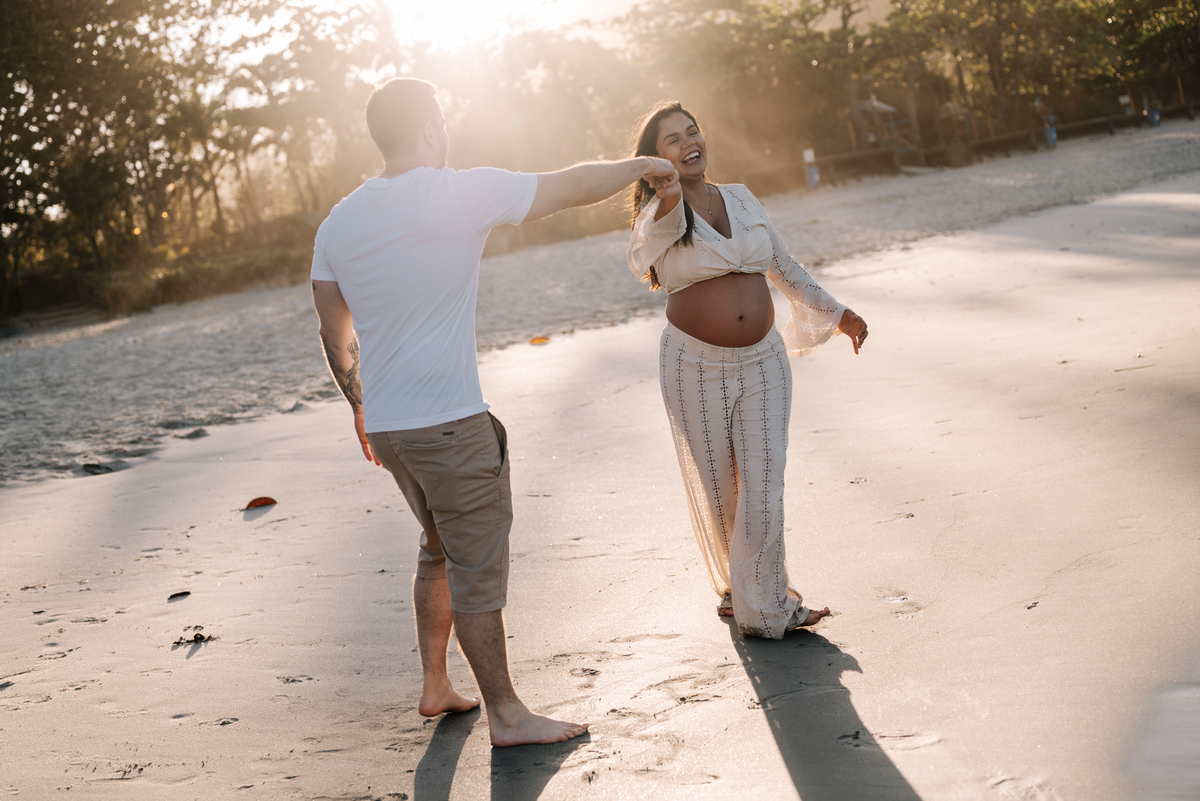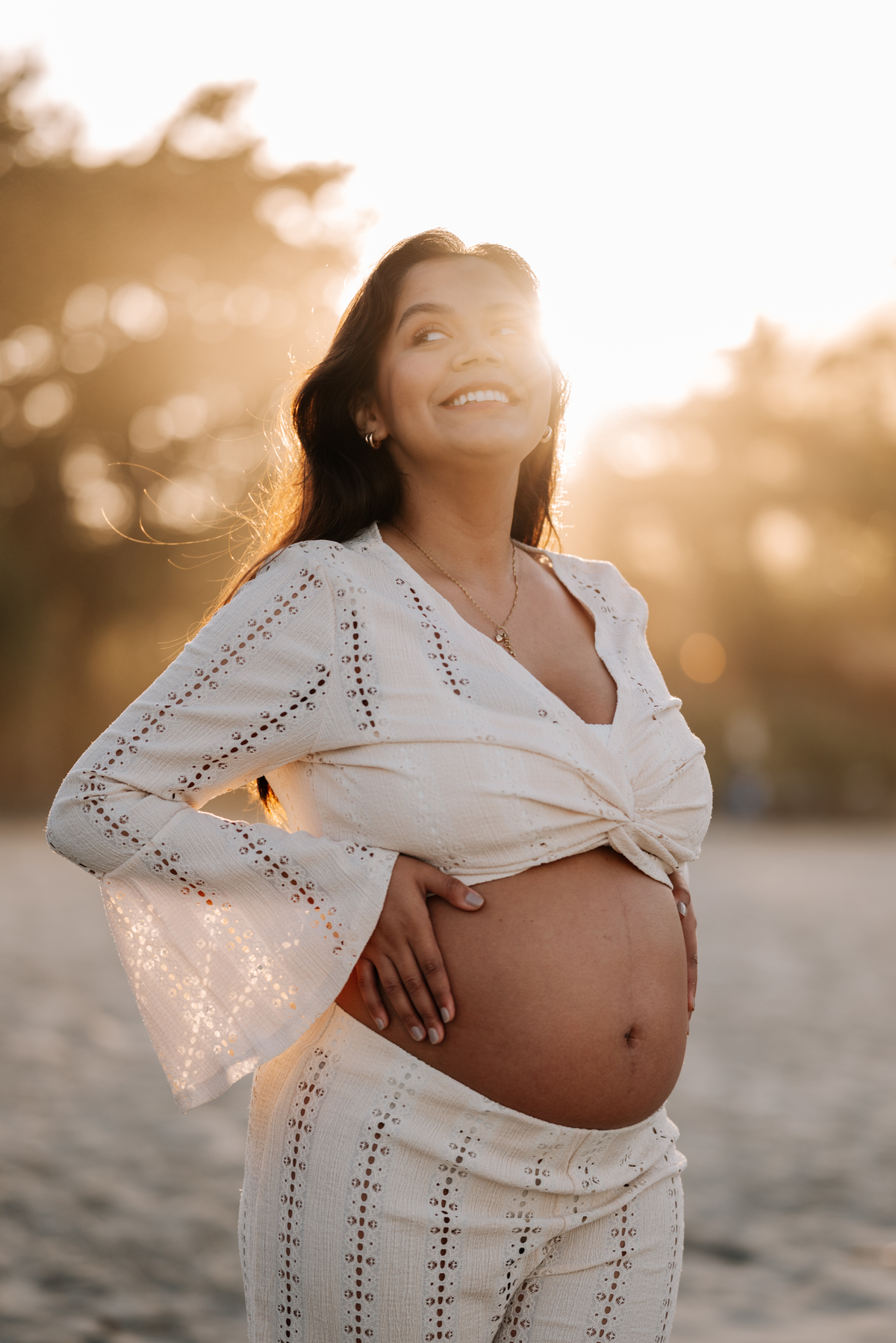 Esse ensaio aconteceu logo nas primeiras horas do dia, com o sol nascendo e as risadas surgindo naturalmente. A gestante viveu o momento com leveza , sem poses rígidas, apenas curtindo o instante e deixando que a conexão com o bebê e o mar conduzisse o registro.