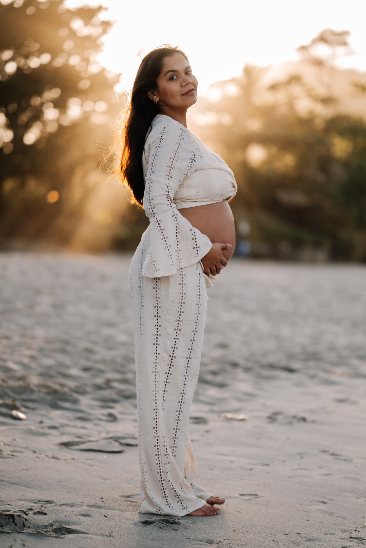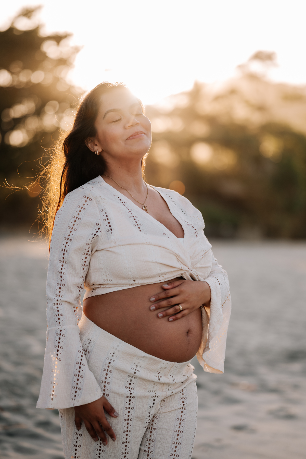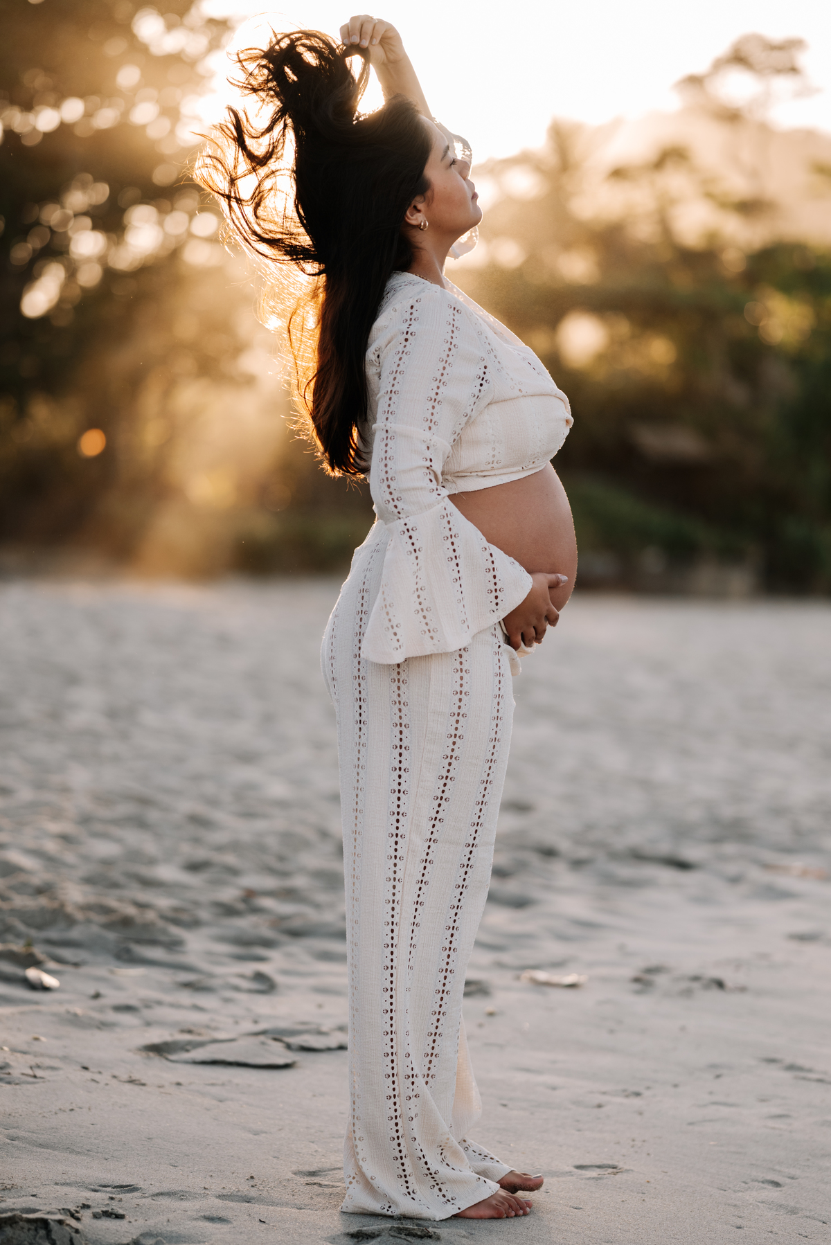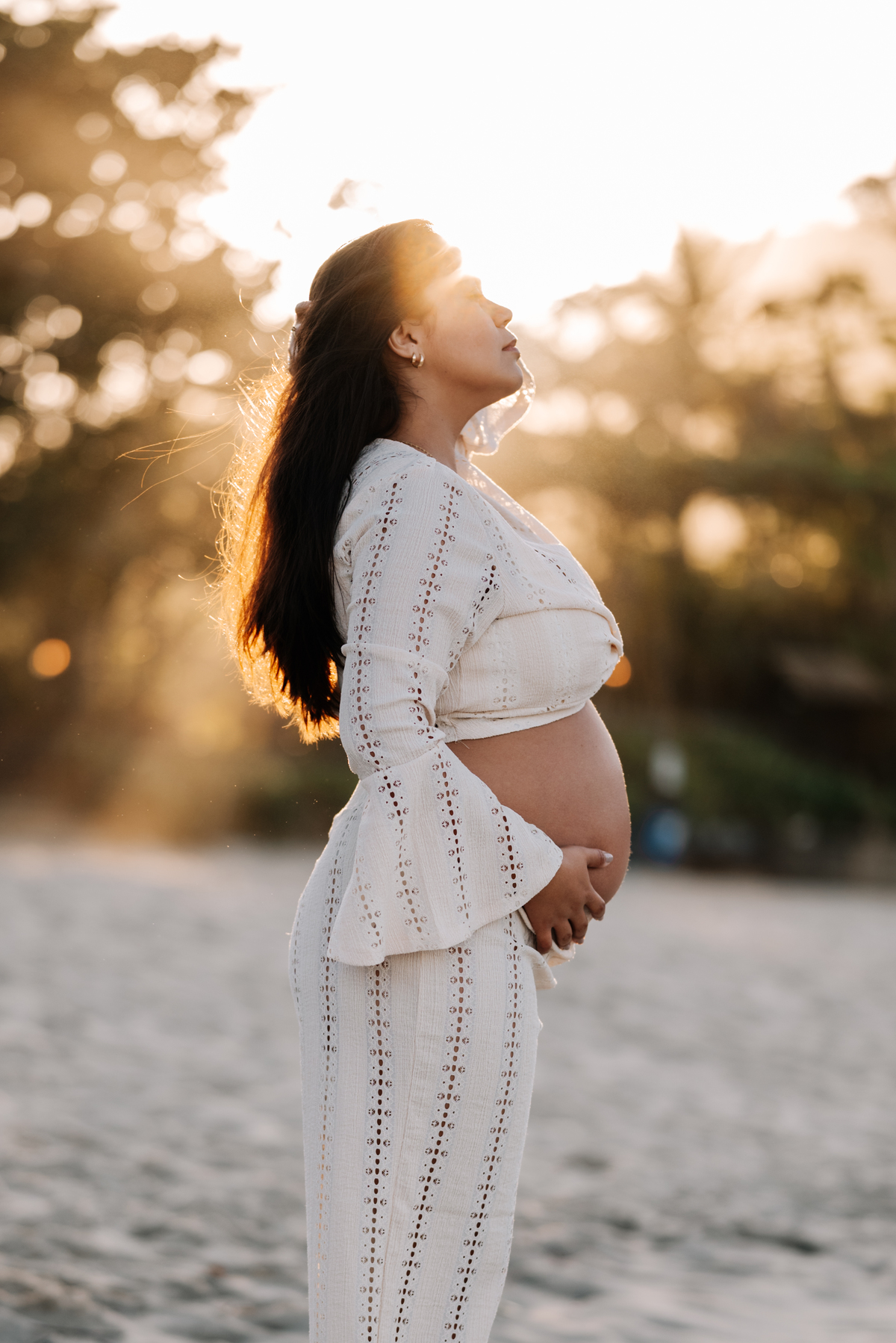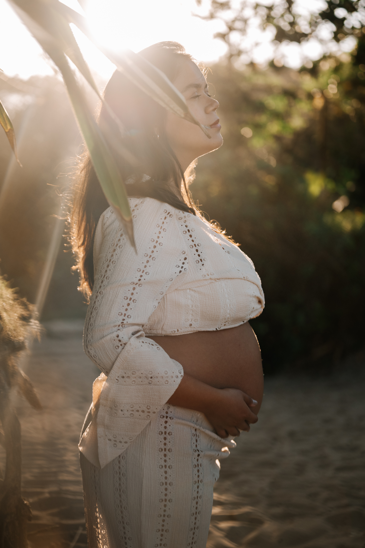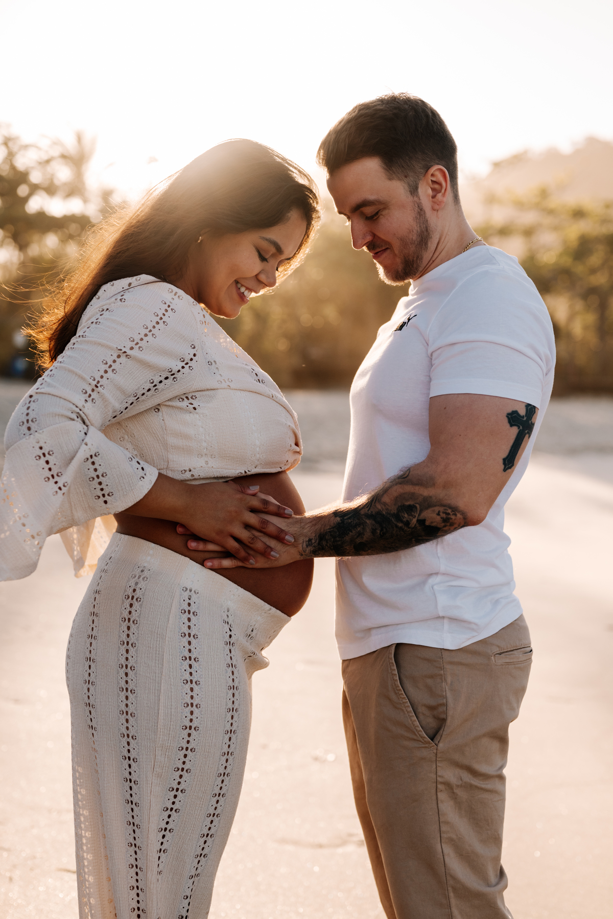 Esse ensaio aconteceu logo nas primeiras horas do dia, com o sol nascendo e as risadas surgindo naturalmente. A gestante viveu o momento com leveza , sem poses rígidas, apenas curtindo o instante e deixando que a conexão com o bebê e o mar conduzisse o registro.