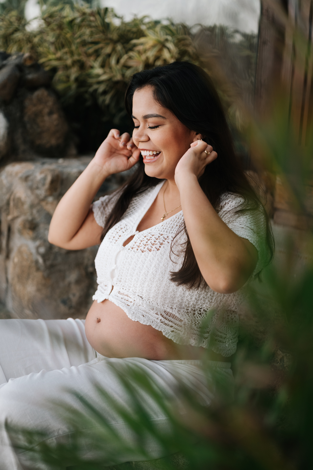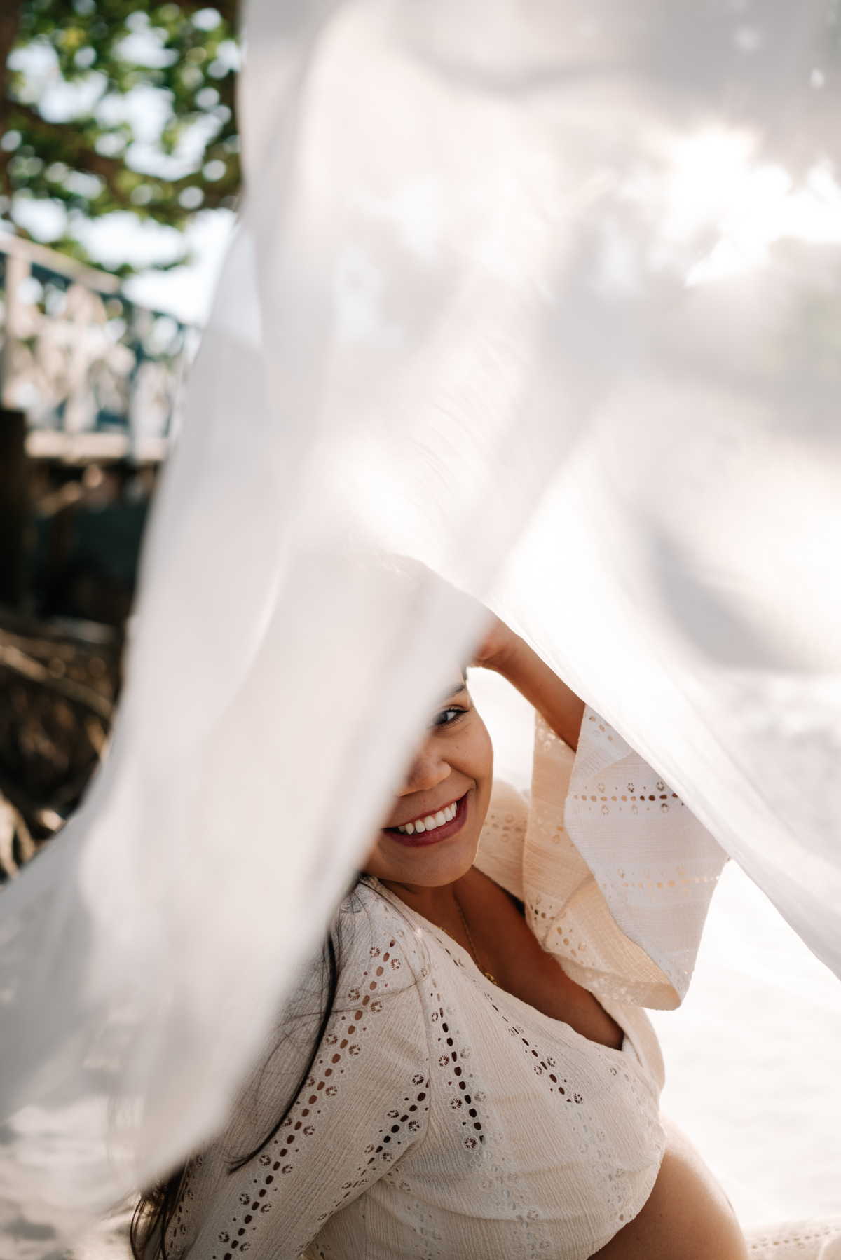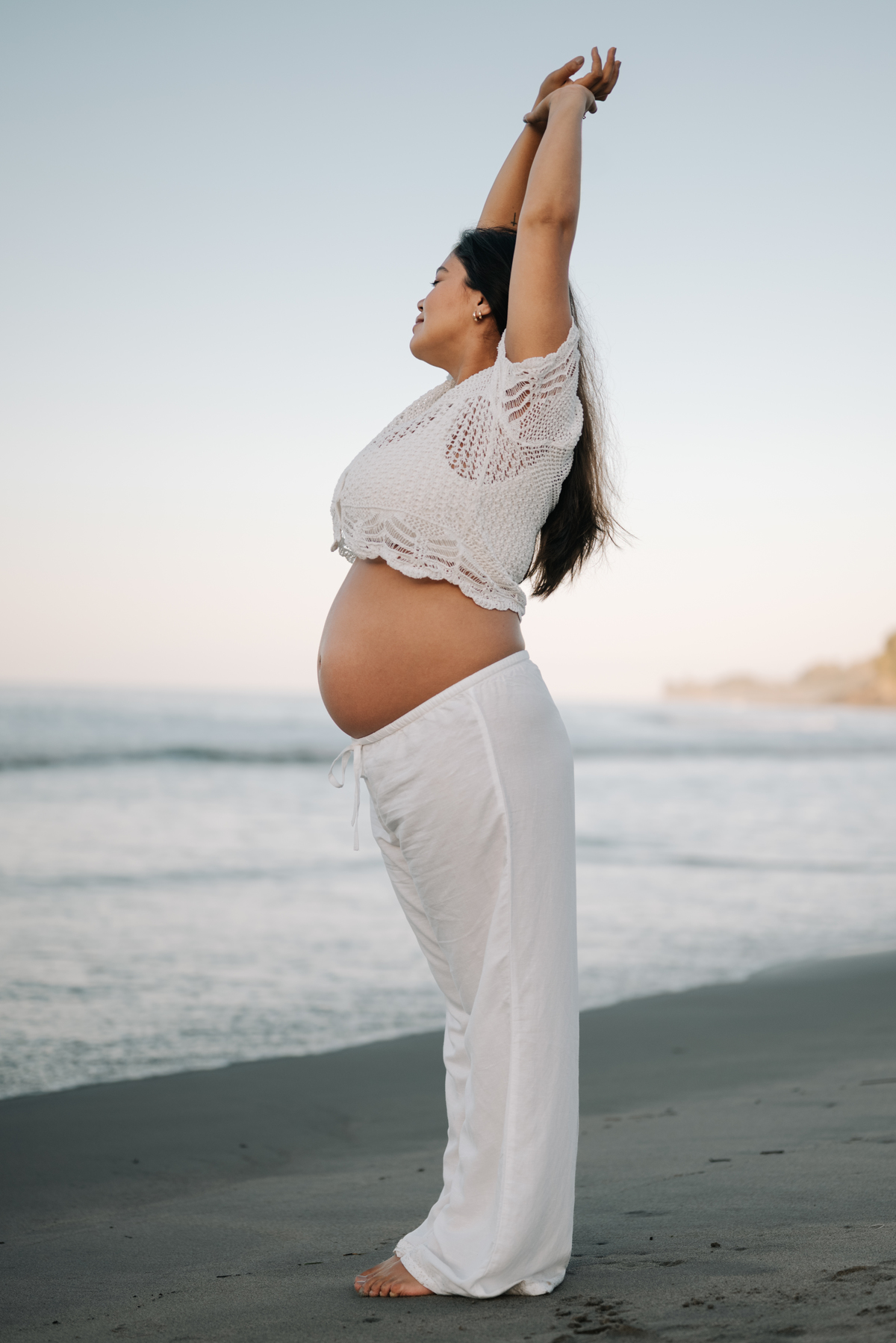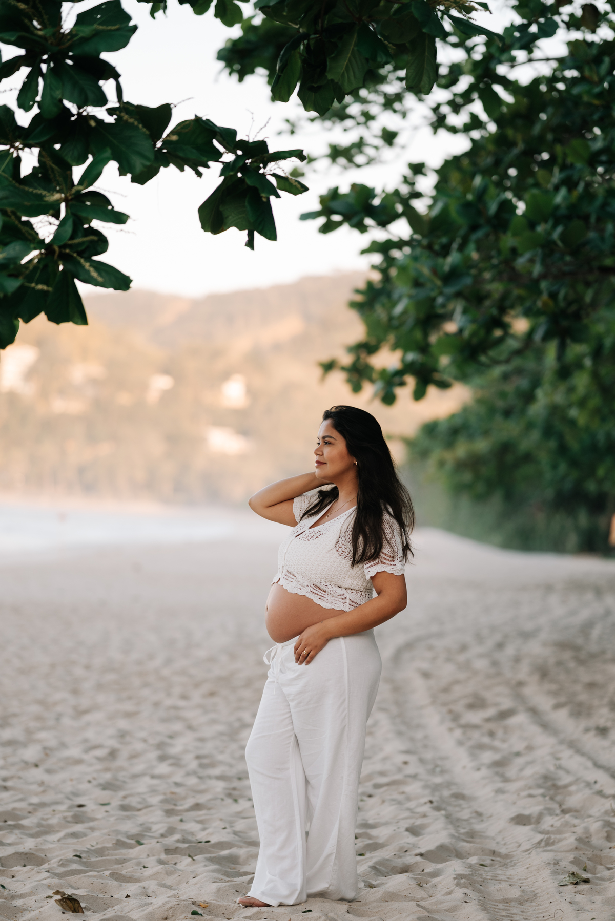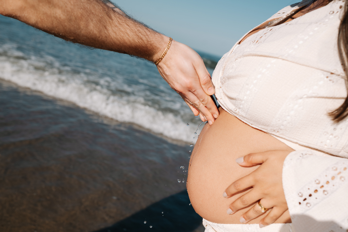 Esse ensaio aconteceu logo nas primeiras horas do dia, com o sol nascendo e as risadas surgindo naturalmente. A gestante viveu o momento com leveza , sem poses rígidas, apenas curtindo o instante e deixando que a conexão com o bebê e o mar conduzisse o registro.