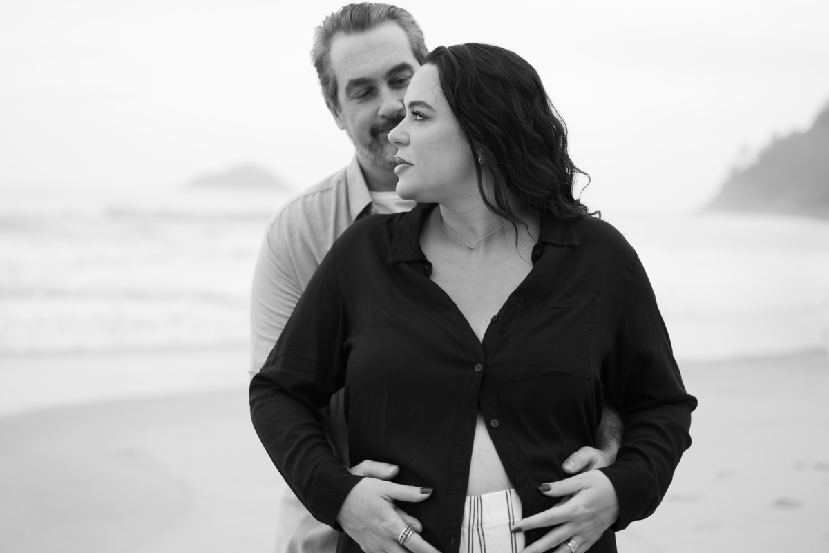 Registrar a gestação na praia não depende de sol forte ou de looks mais expostos. A luz difusa do dia nublado traz um charme único, deixando tudo mais leve, confortável e real.