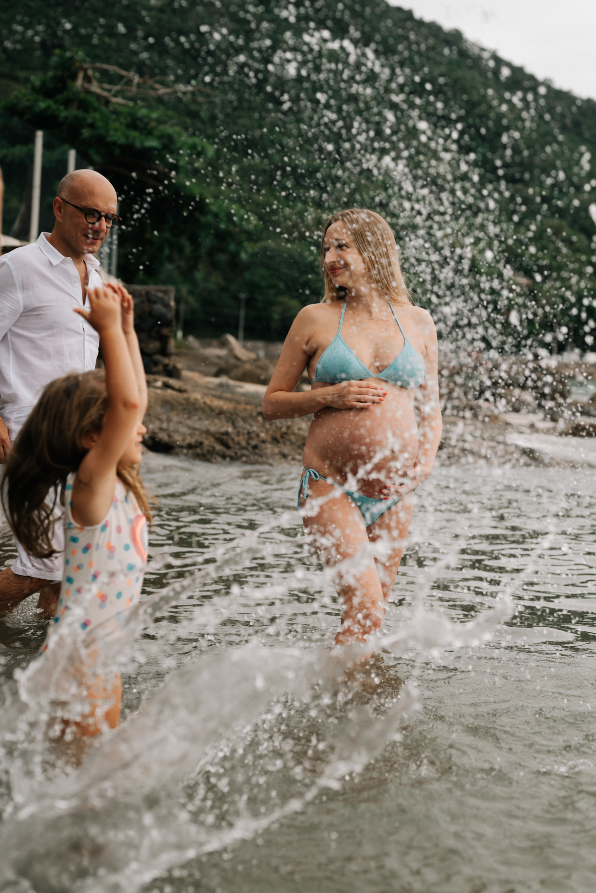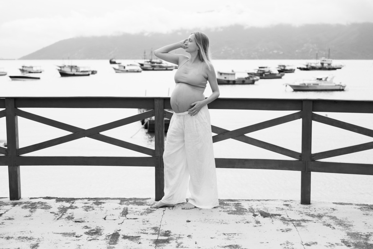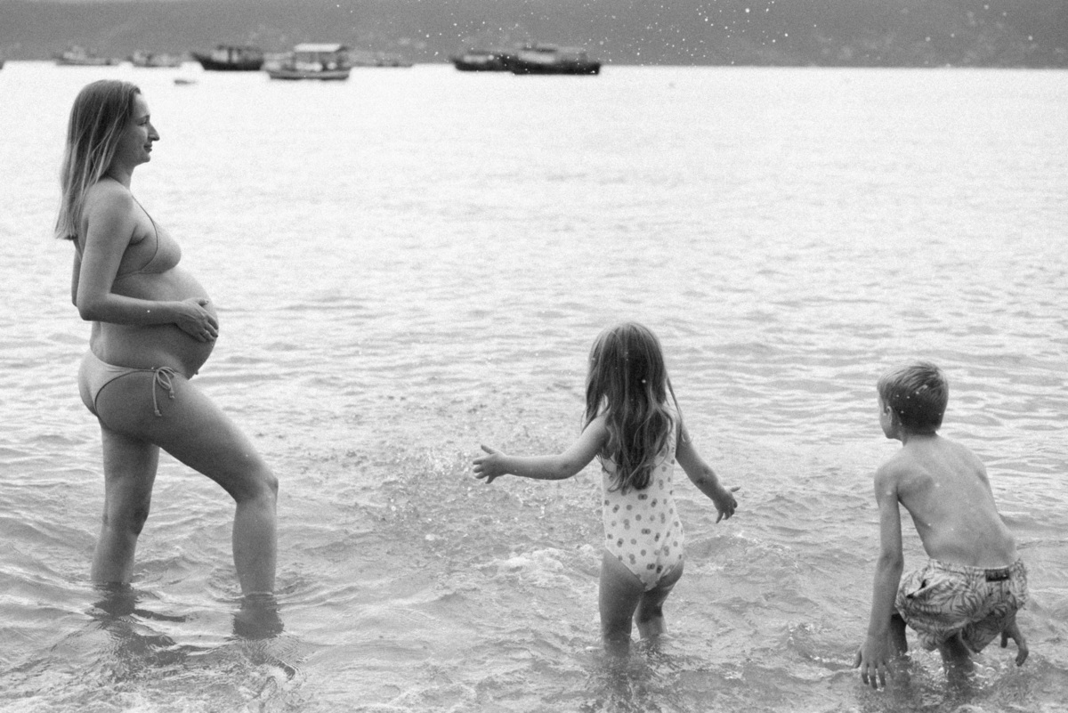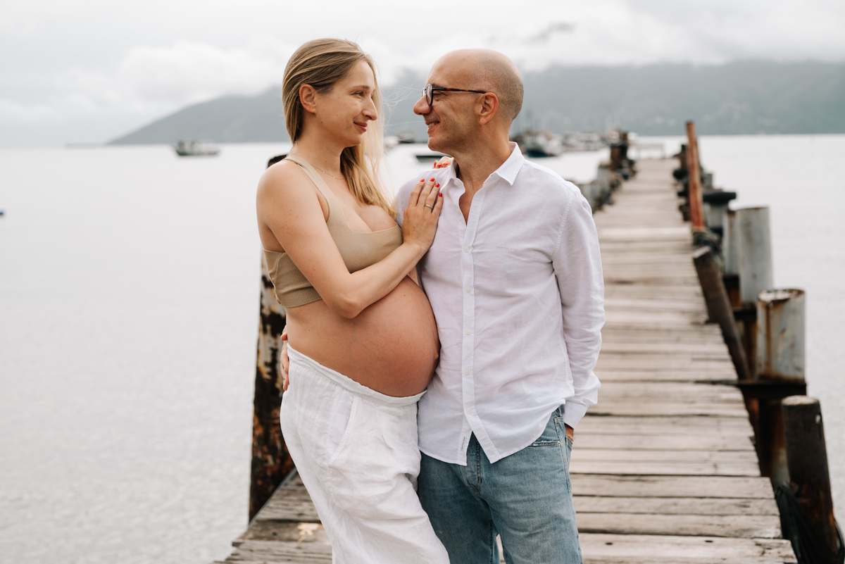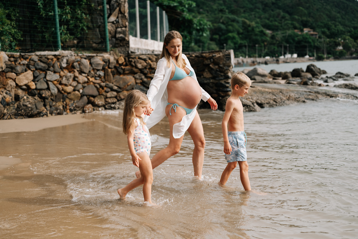 O ensaio gestante aconteceu em São Sebastião, começando na casa onde a família estava hospedada, com calma, conversa e tempo para se sentirem à vontade. Depois, seguimos para a praia, explorando o cenário natural, a luz e a liberdade que só o litoral oferece.