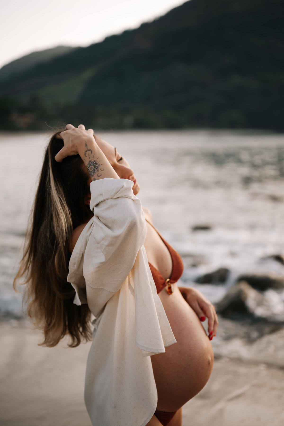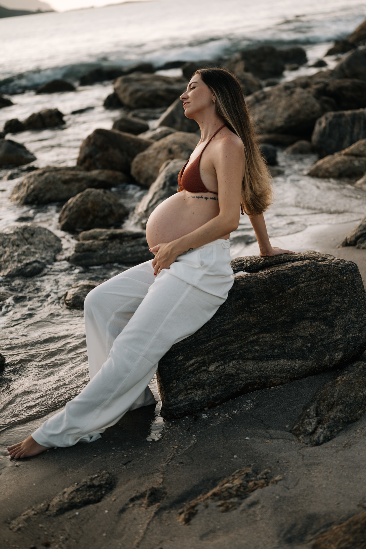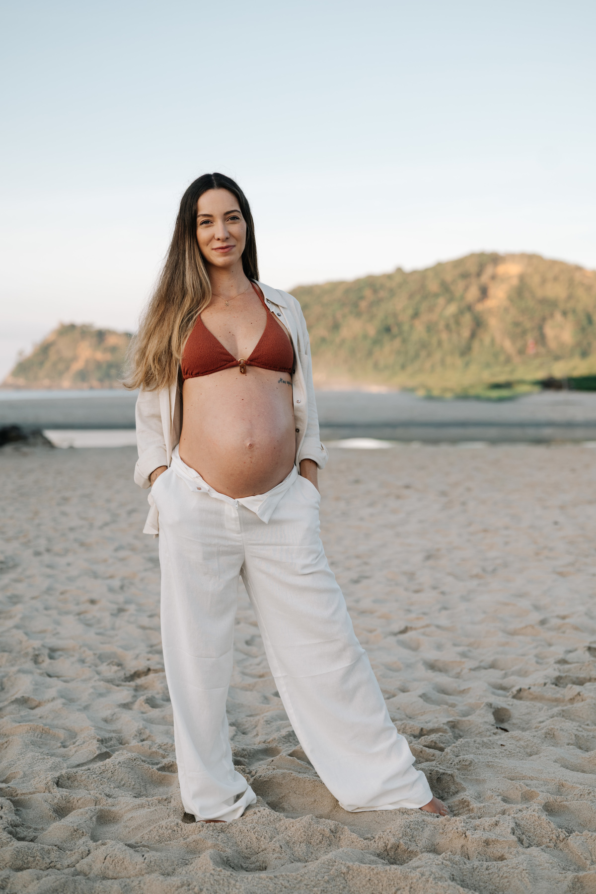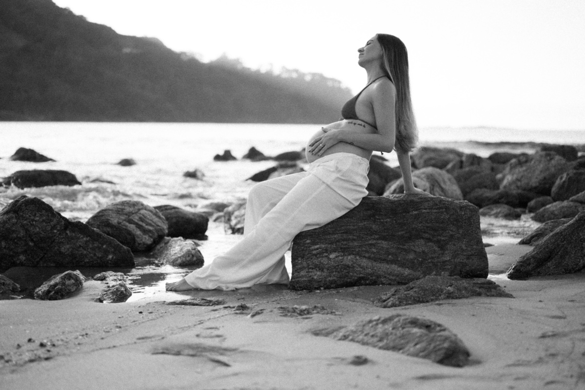Esse ensaio gestante foi realizado no início da manhã, em Camburi, no Litoral Norte de São Paulo. Um horário escolhido não só pela luz suave, mas pela experiência: menos movimento, mais conexão e tempo para respeitar o corpo, as pausas e o momento de quem está vivendo a espera.