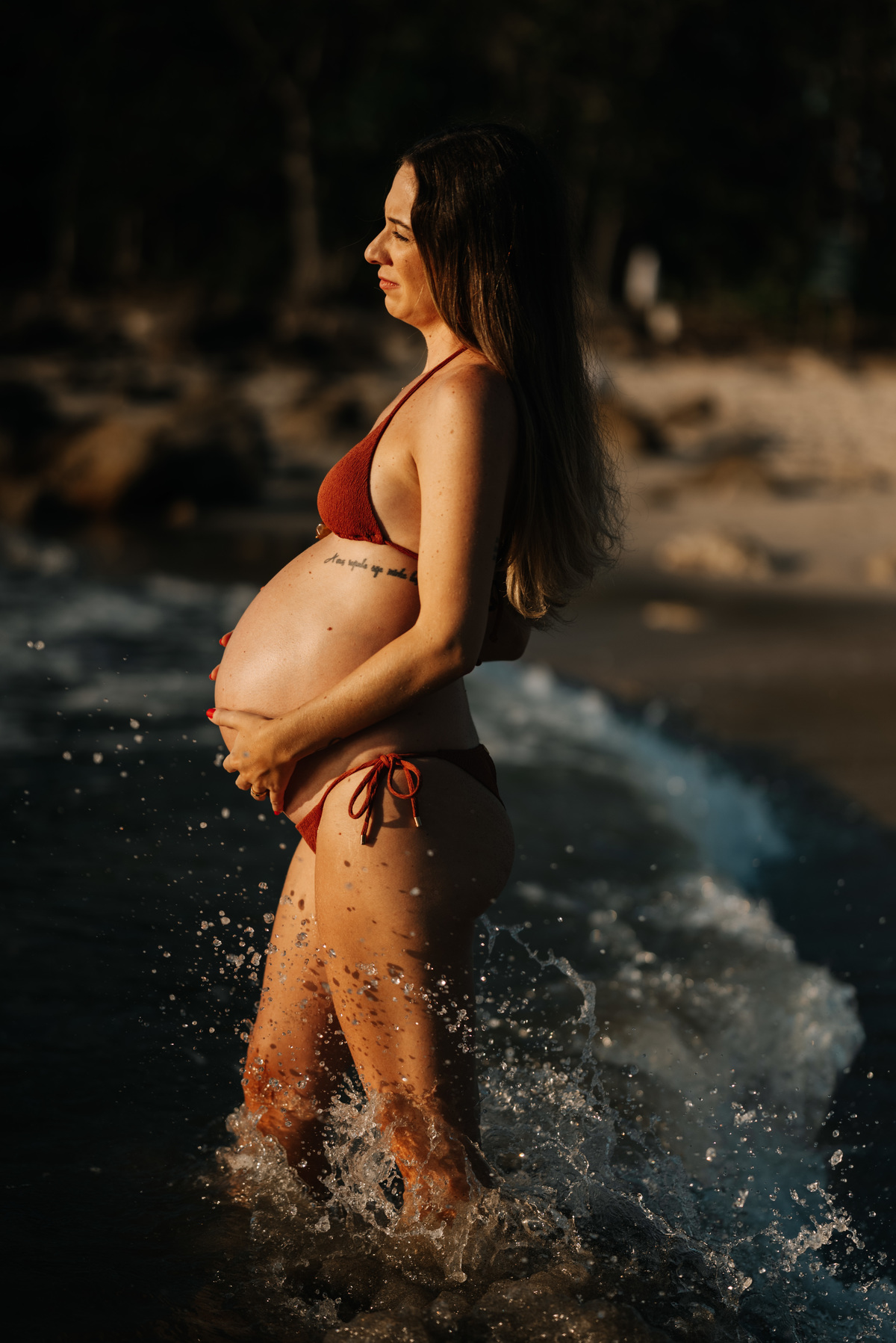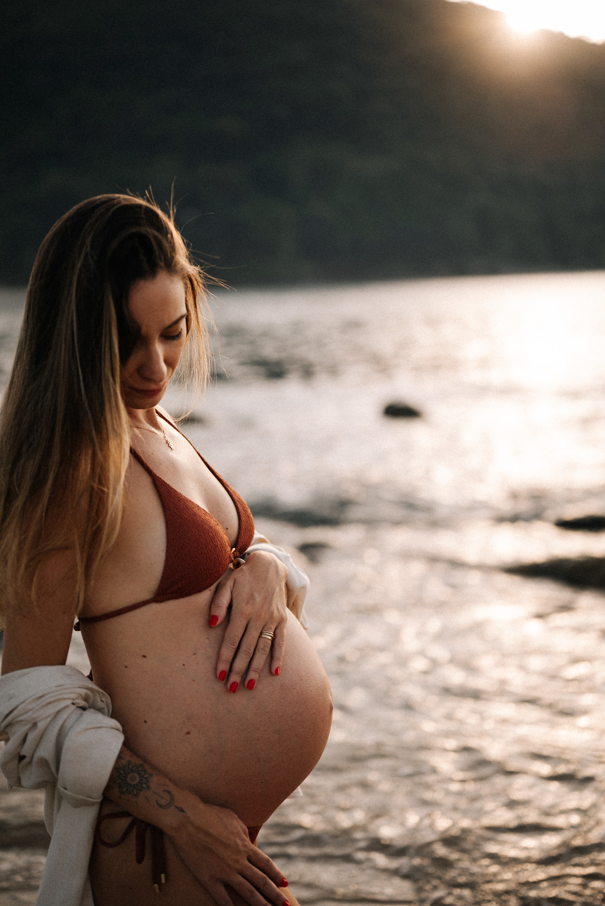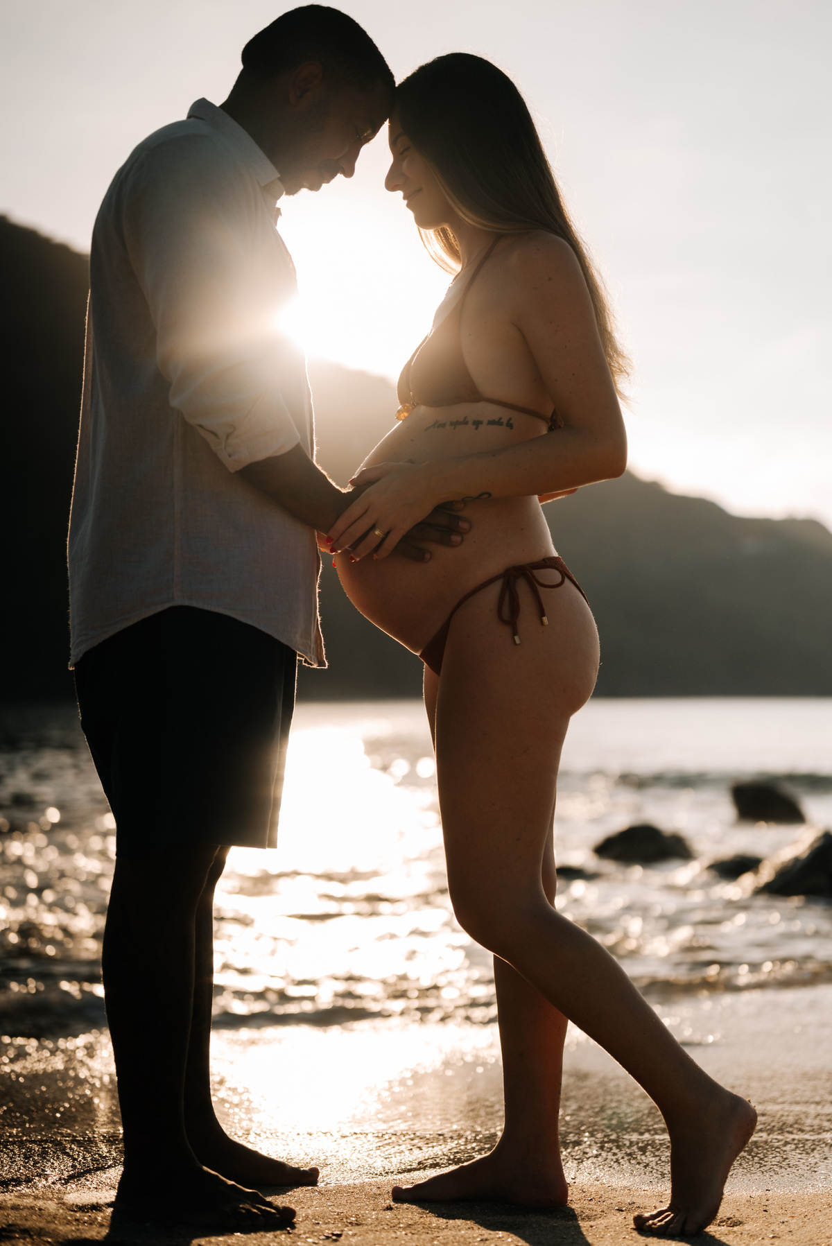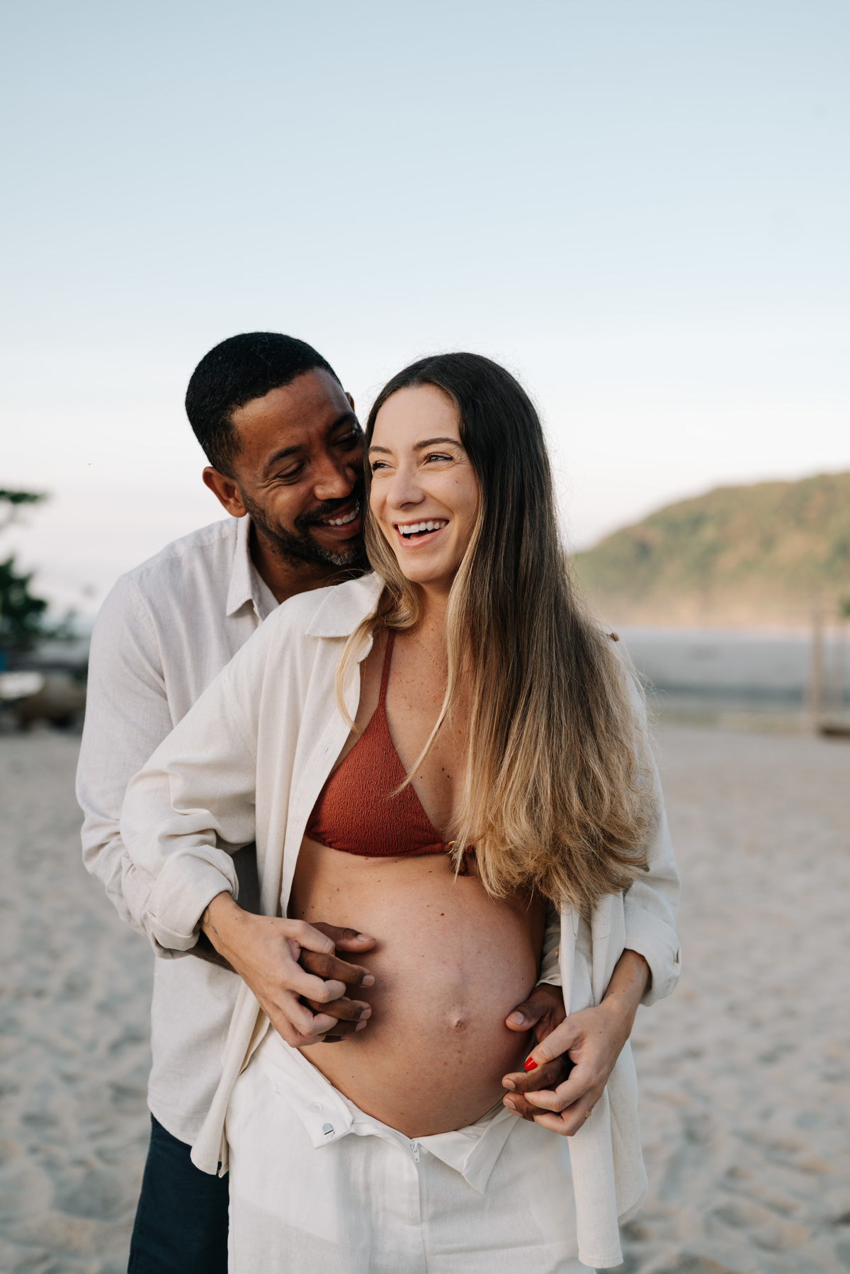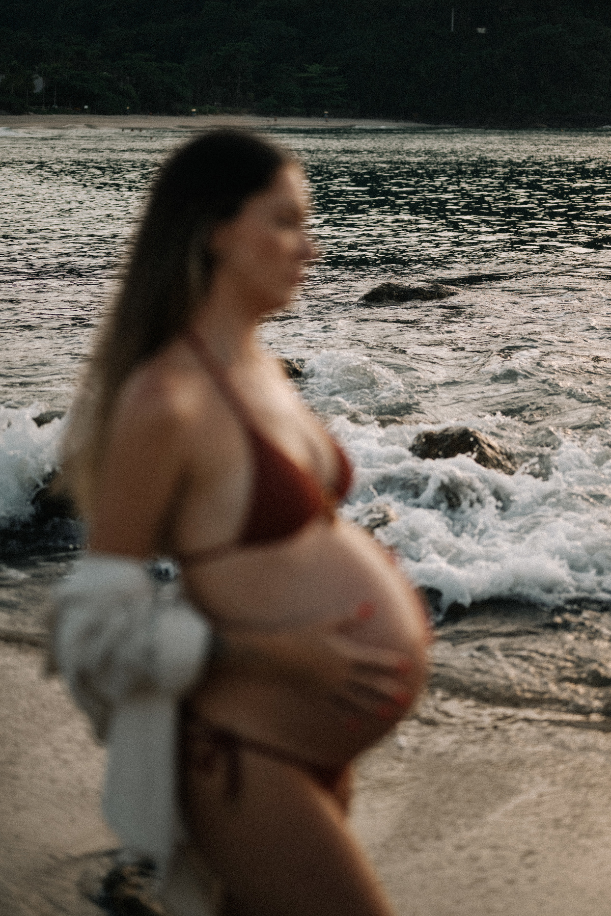 Esse ensaio gestante foi realizado no início da manhã, em Camburi, no Litoral Norte de São Paulo. Um horário escolhido não só pela luz suave, mas pela experiência: menos movimento, mais conexão e tempo para respeitar o corpo, as pausas e o momento de quem está vivendo a espera.