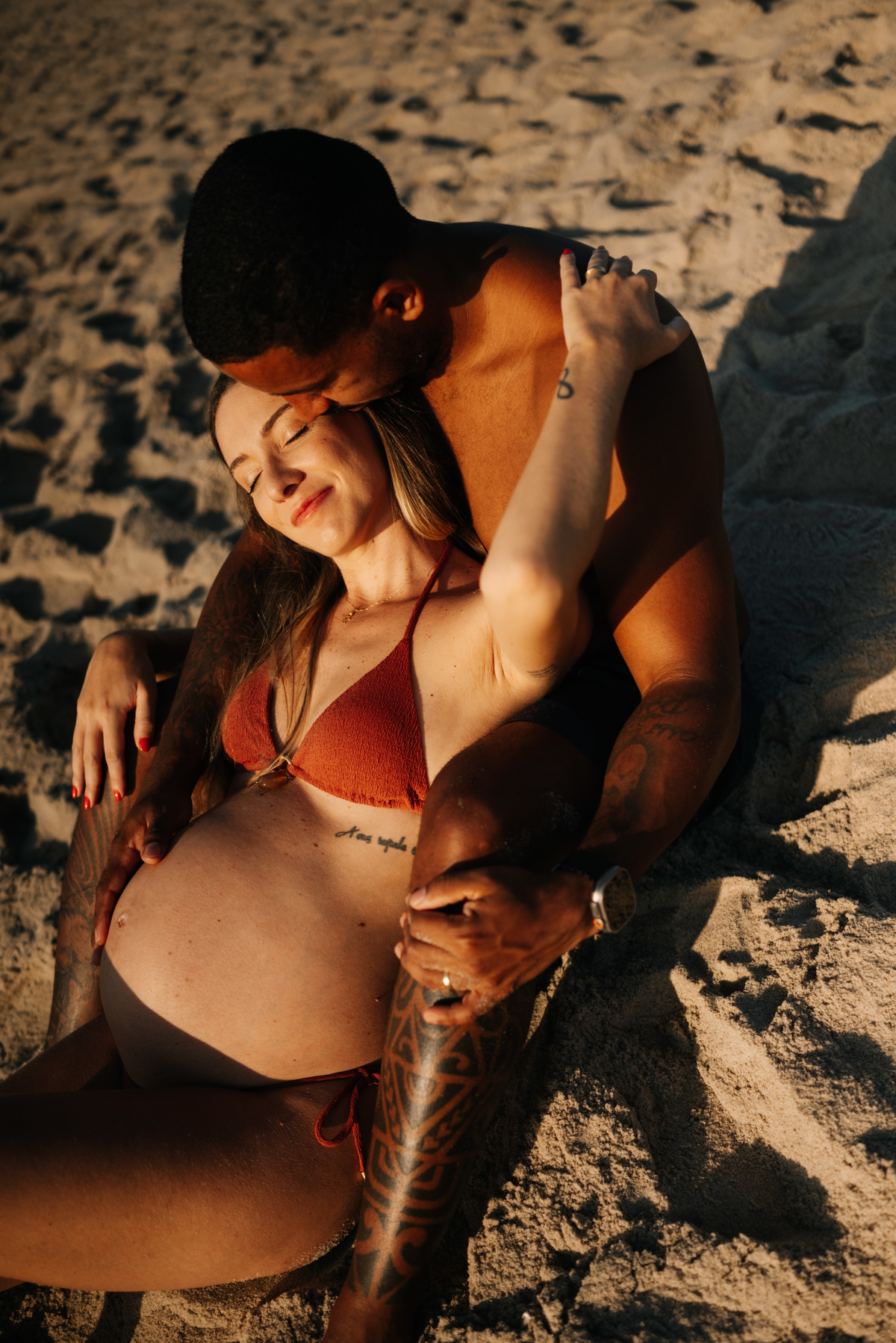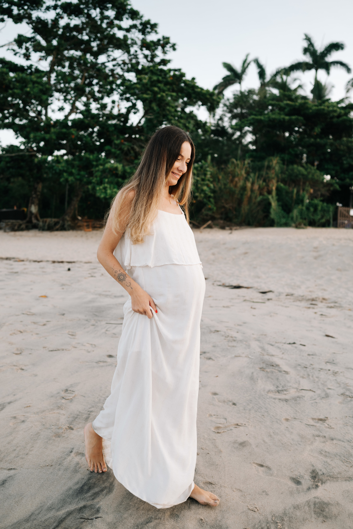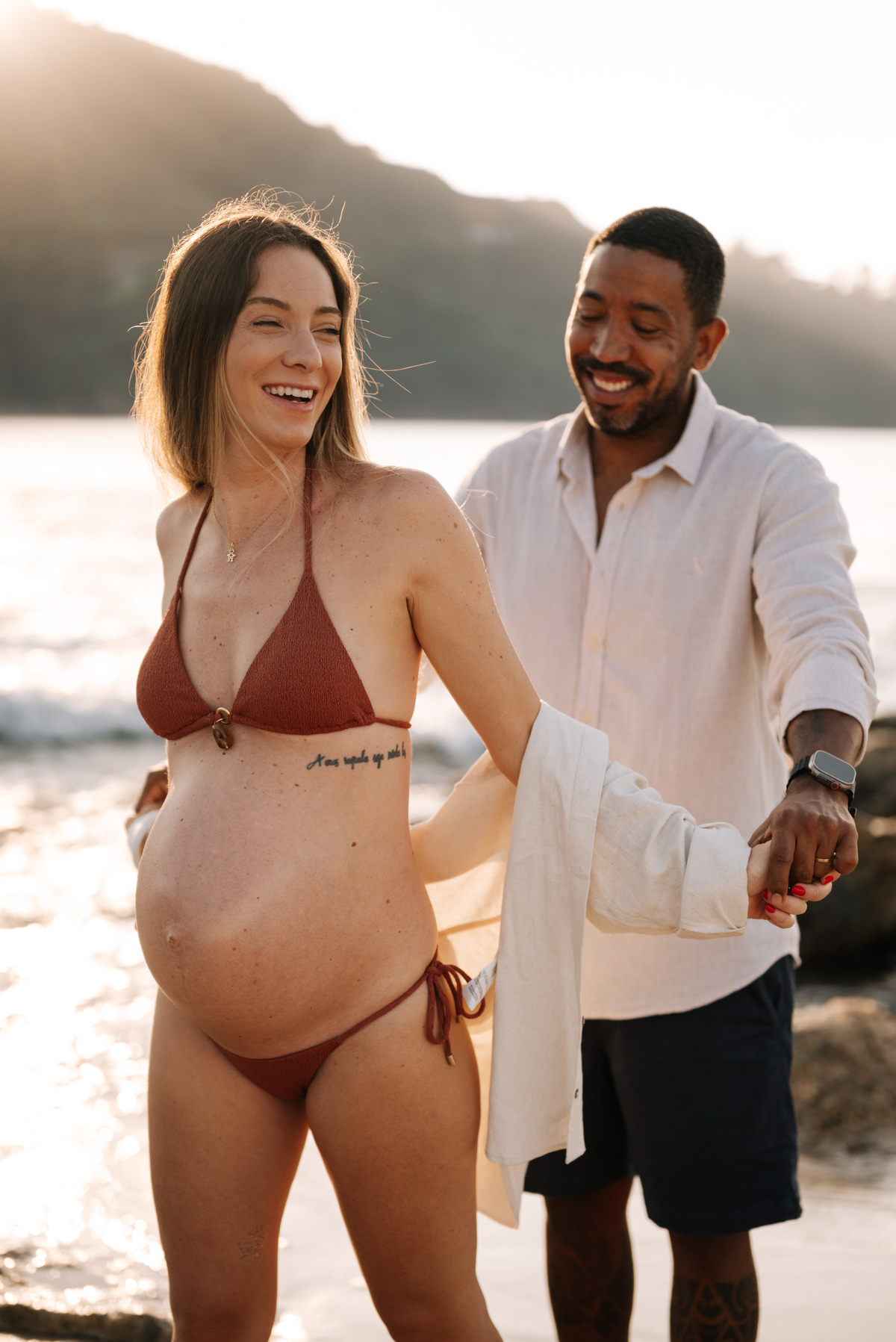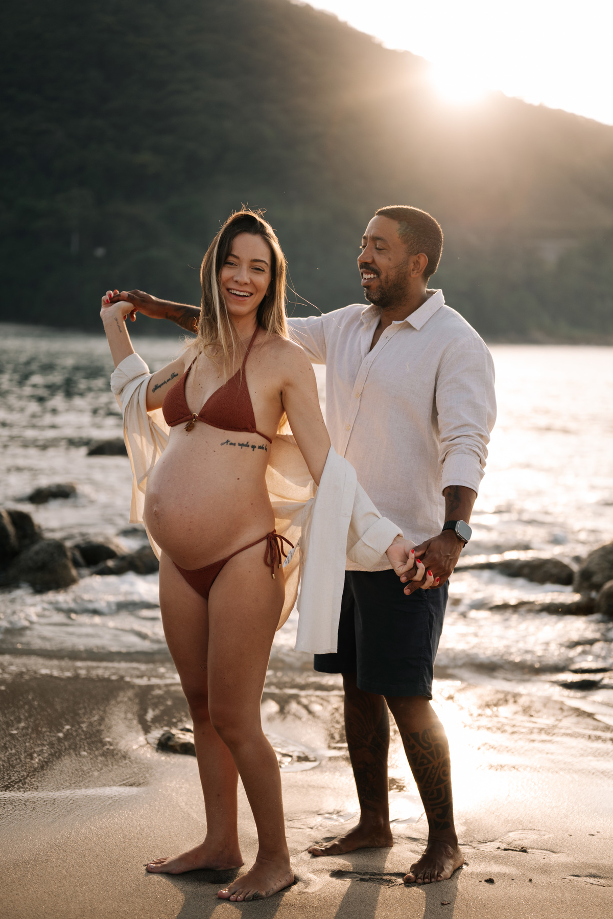Esse ensaio gestante foi realizado no início da manhã, em Camburi, no Litoral Norte de São Paulo. Um horário escolhido não só pela luz suave, mas pela experiência: menos movimento, mais conexão e tempo para respeitar o corpo, as pausas e o momento de quem está vivendo a espera.