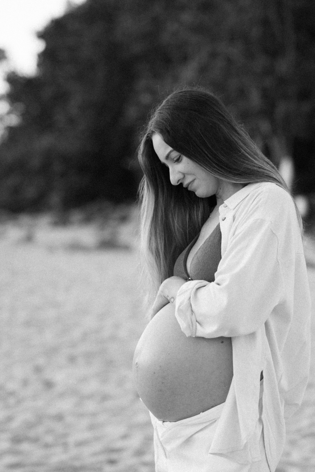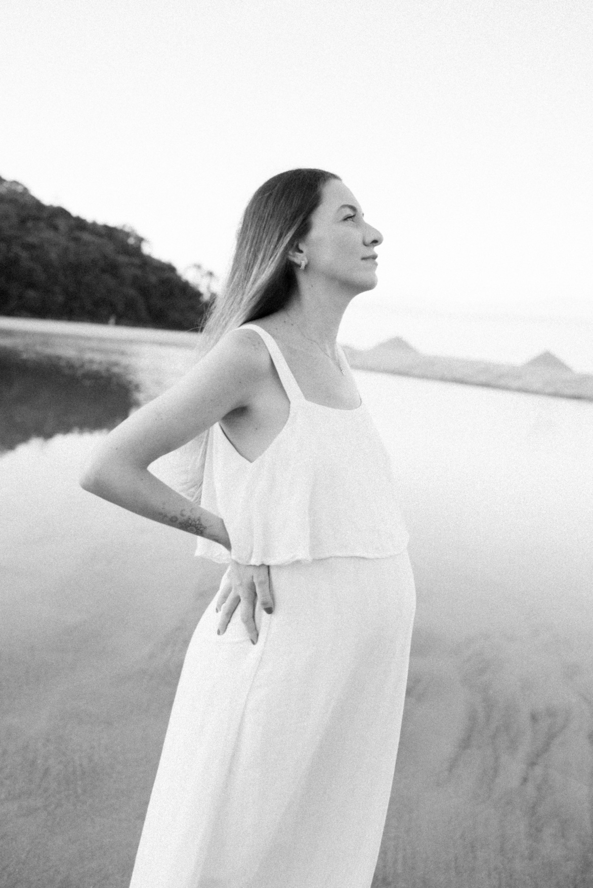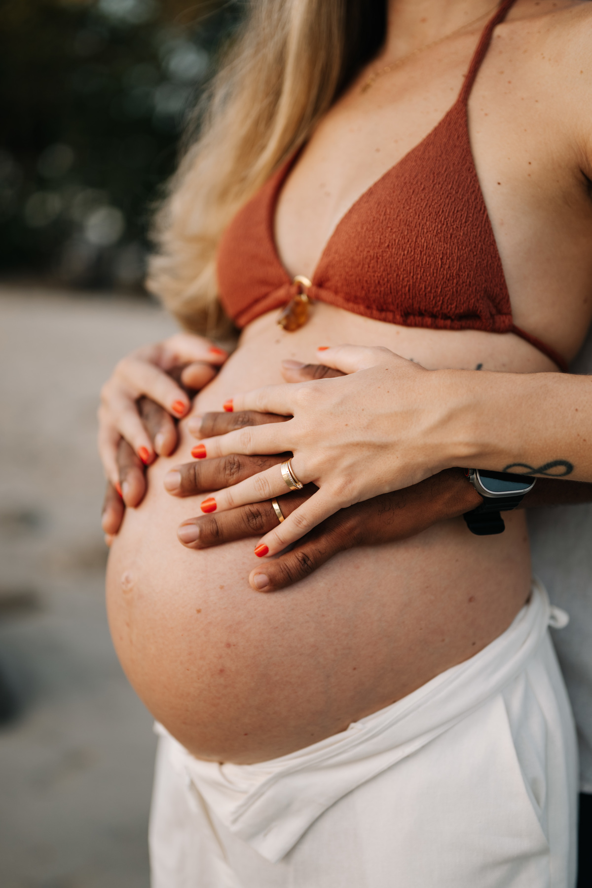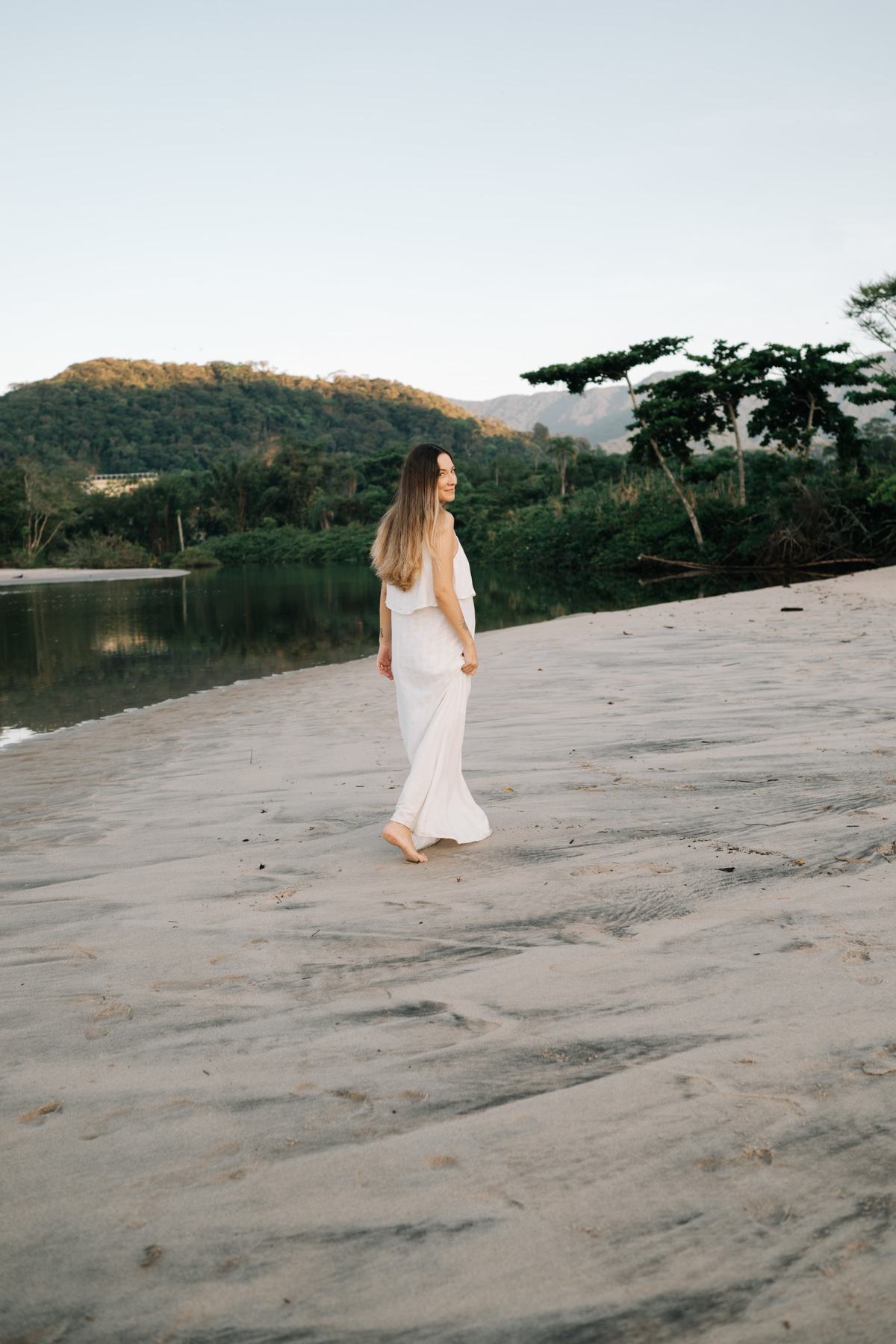 Esse ensaio gestante foi realizado no início da manhã, em Camburi, no Litoral Norte de São Paulo. Um horário escolhido não só pela luz suave, mas pela experiência: menos movimento, mais conexão e tempo para respeitar o corpo, as pausas e o momento de quem está vivendo a espera.